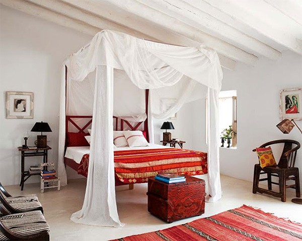 مزيج إبداعي من الأثاث الأبيض والديكور غير العادي في شكل ستارة خفيفة ومفرش مع وسائد بنفس اللون