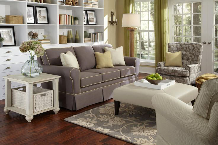 يتم استخدام الترتيب الدائري لإنشاء منطقة جلوس مريحة عند وضع الأثاث المنجد حول طاولة القهوة.