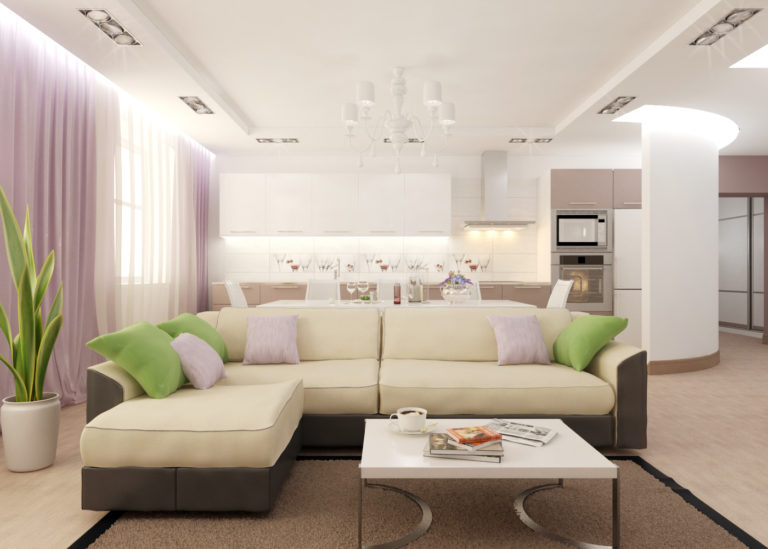 تصميم غرفة معيشة مستطيلة طويلة بألوان البيج والأرجواني.