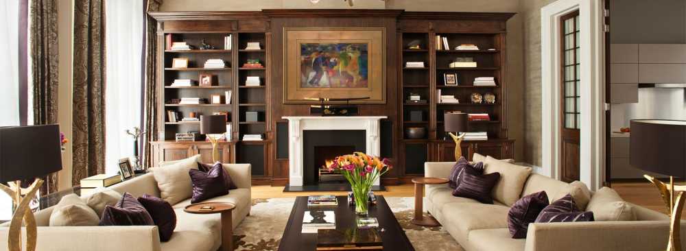ترتيب متماثل للأثاث المنجد ، تتمحور حول الموقد وطاولة القهوة ، وجهاً لوجه