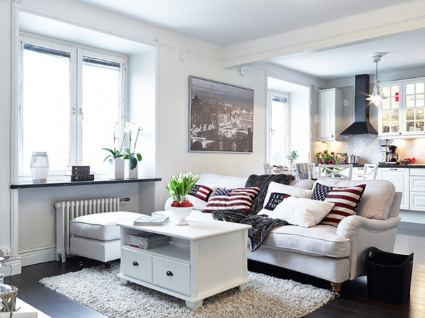 - الاكتناز. على سبيل المثال ، يمكنك استخدام العديد من الأرائك الصغيرة الأريكة بدلاً من تشوش المساحة الحرة بواحدة كبيرة. لذلك سوف تبدو الغرفة أكثر اتساعًا بصريًا.