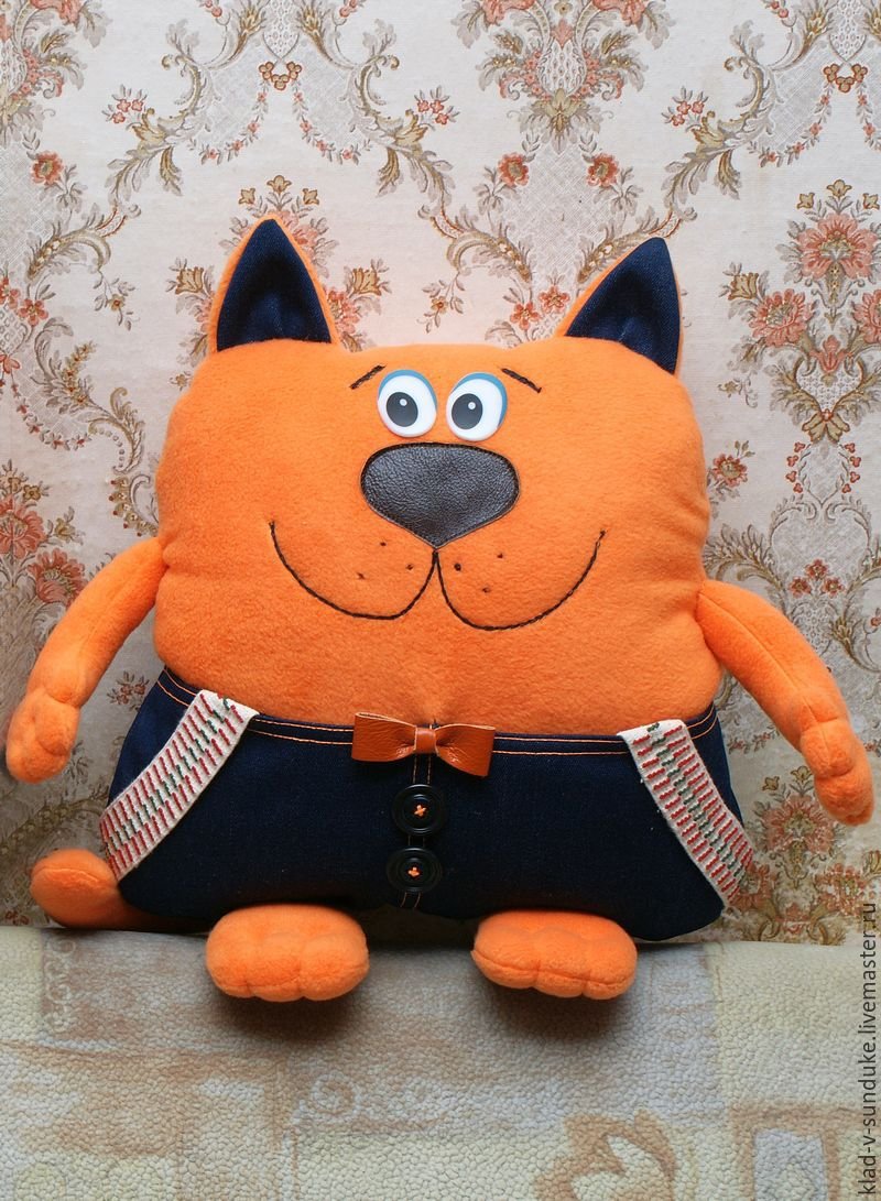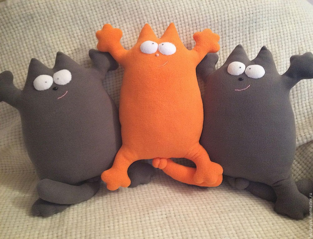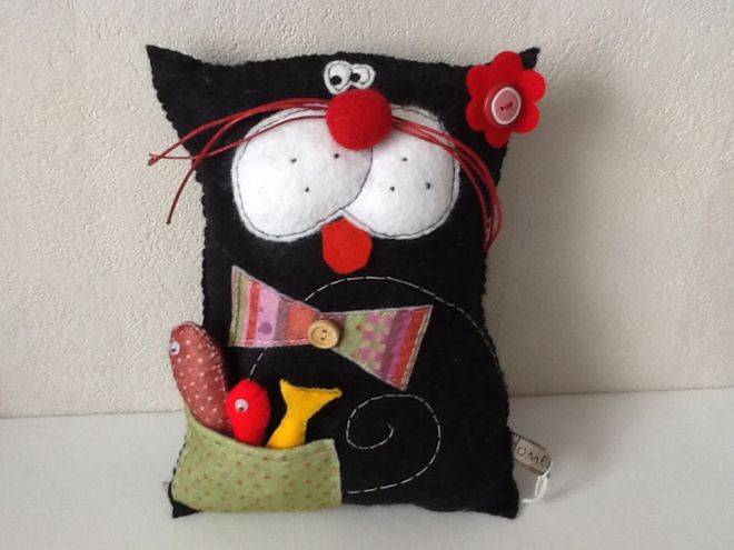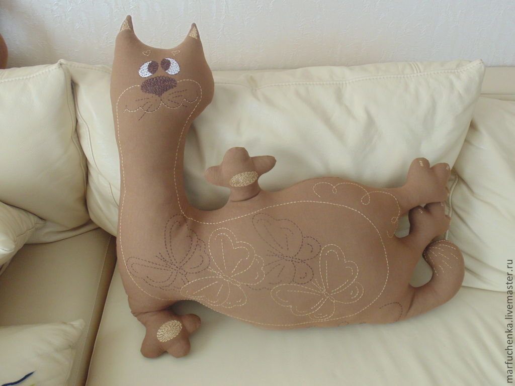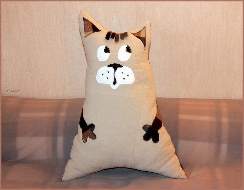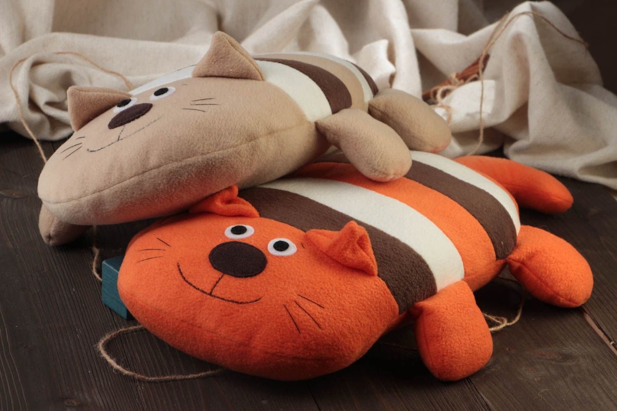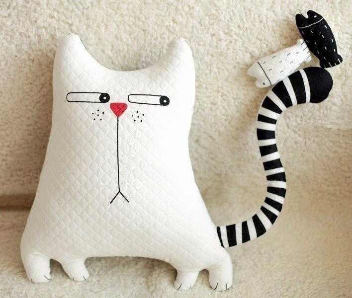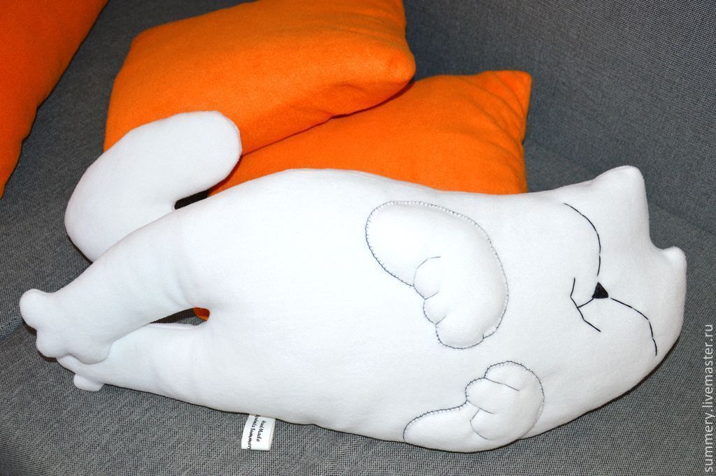 لكي لا تكون الوسادة مجهولي الهوية ، يمكن تنفيذها على شكل قطة سخيفة. بالإضافة إلى كمامة ، يمكنك أيضا تشكيل الكفوف والذيل. تقنية التنفيذ مذكورة أعلاه. الشيء الوحيد الذي يمكن التوصية به هنا هو خياطة عناصر العينين والأنف بغرزة متعرجة للتثبيت الآمن.