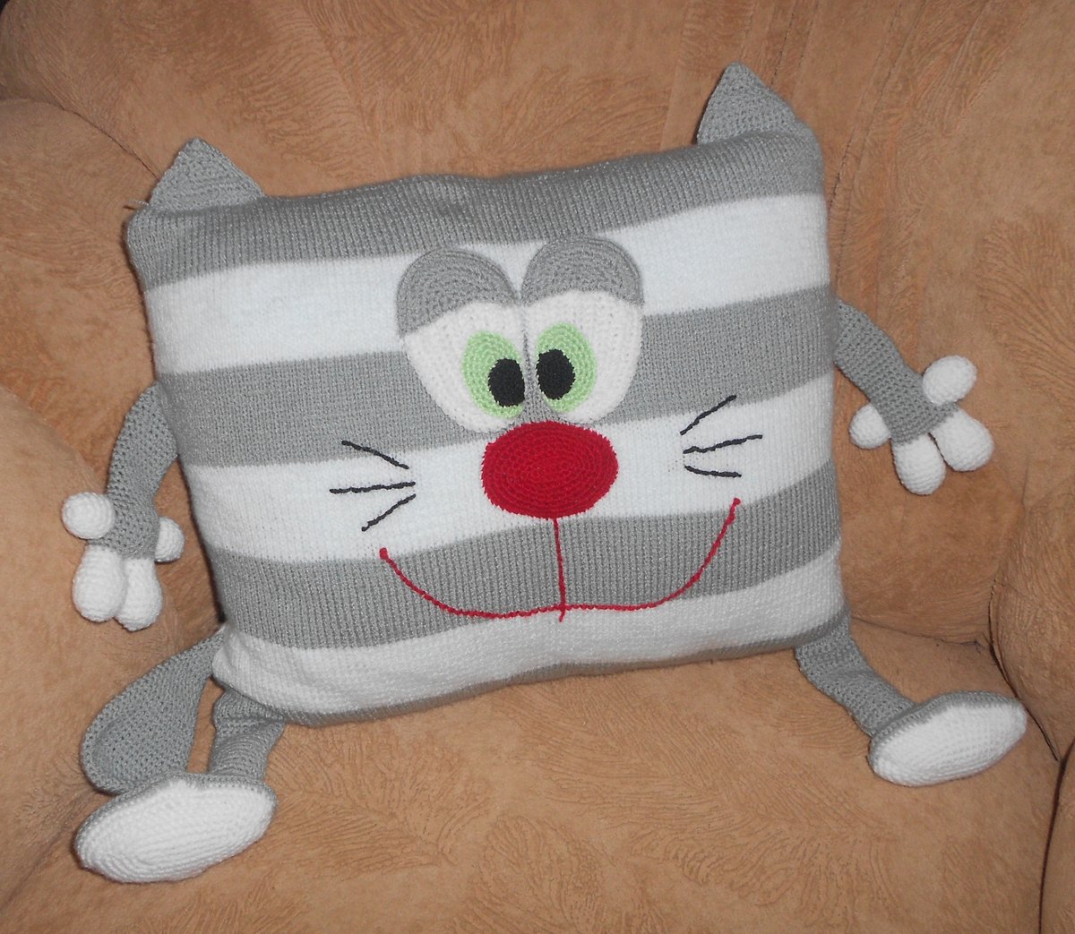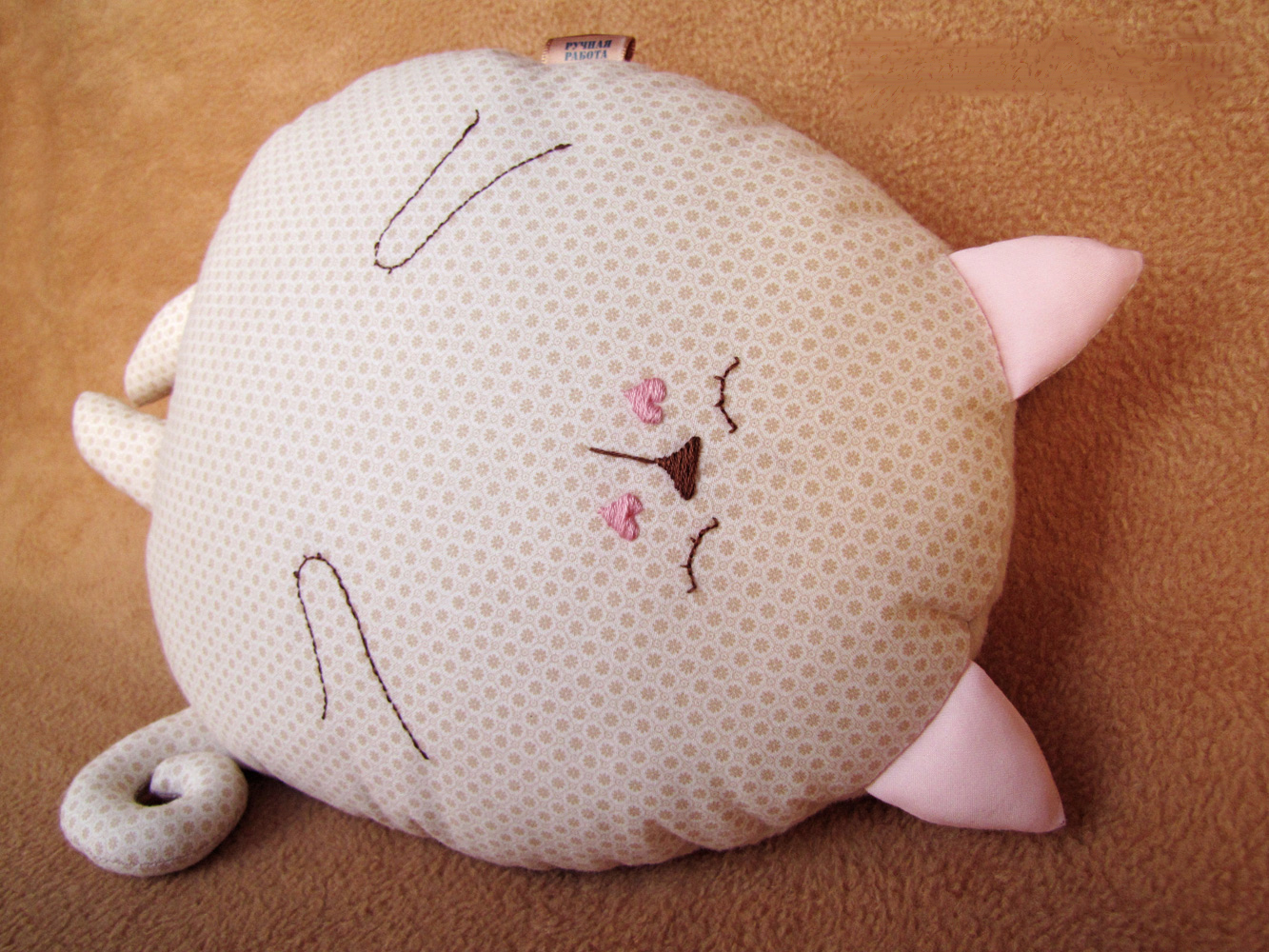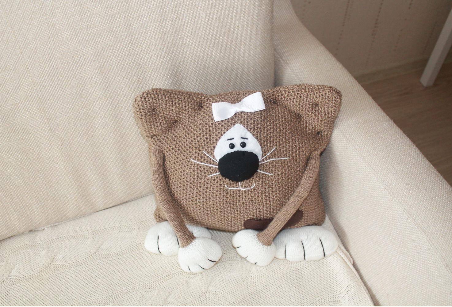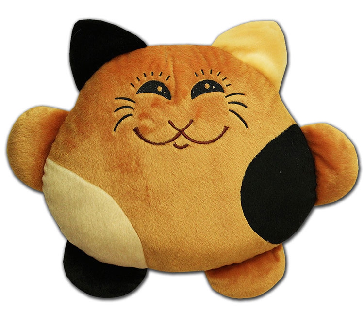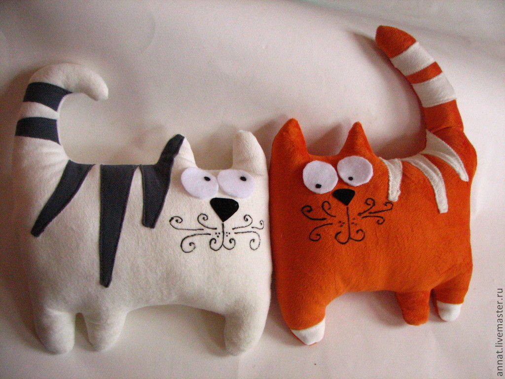 لكي لا تكون الوسادة مجهولي الهوية ، يمكن تنفيذها على شكل قطة سخيفة. بالإضافة إلى كمامة ، يمكنك أيضا تشكيل الكفوف والذيل. تقنية التنفيذ مذكورة أعلاه. الشيء الوحيد الذي يمكن التوصية به هنا هو خياطة عناصر العينين والأنف بغرزة متعرجة للتثبيت الآمن.