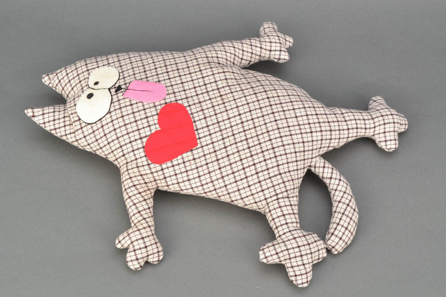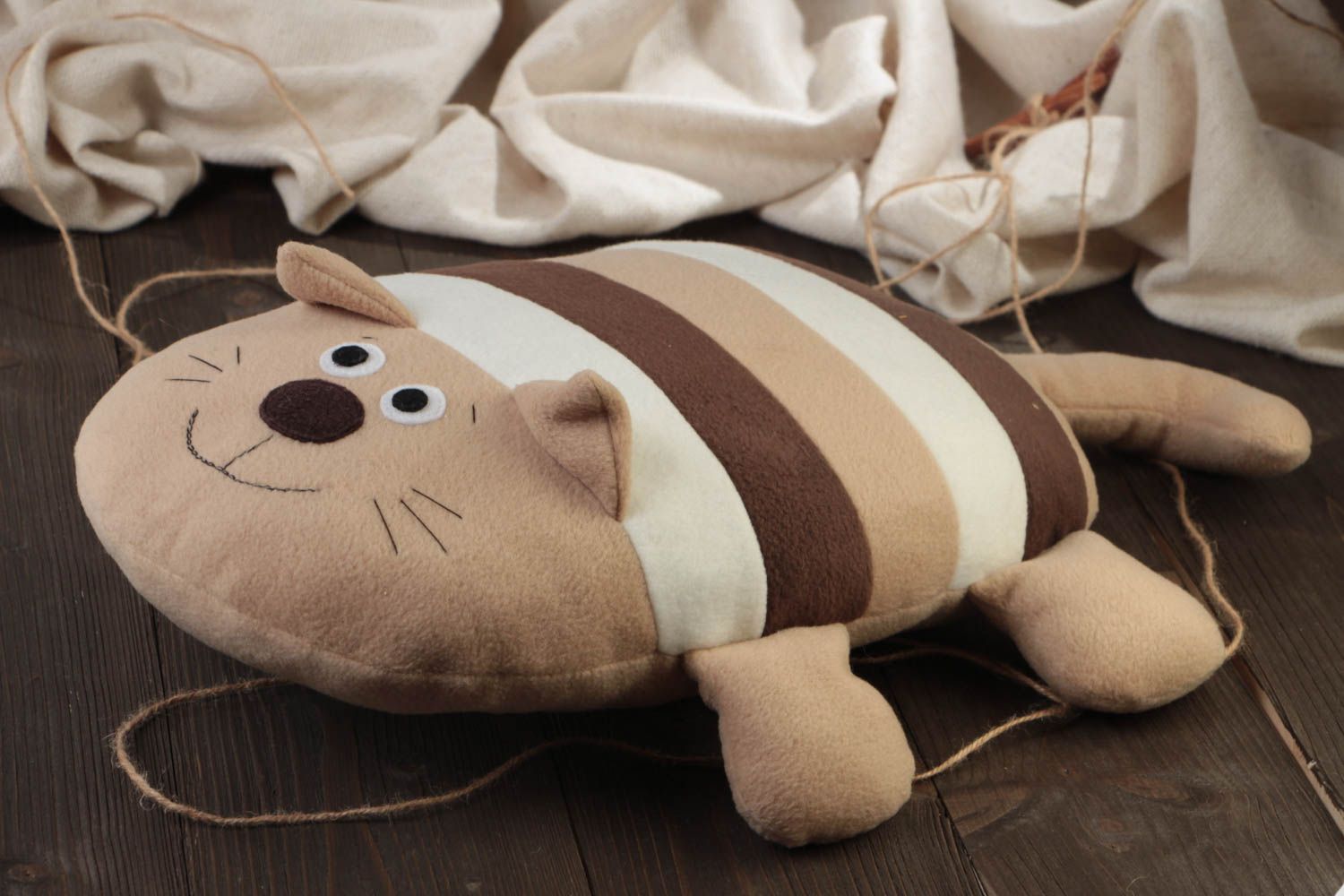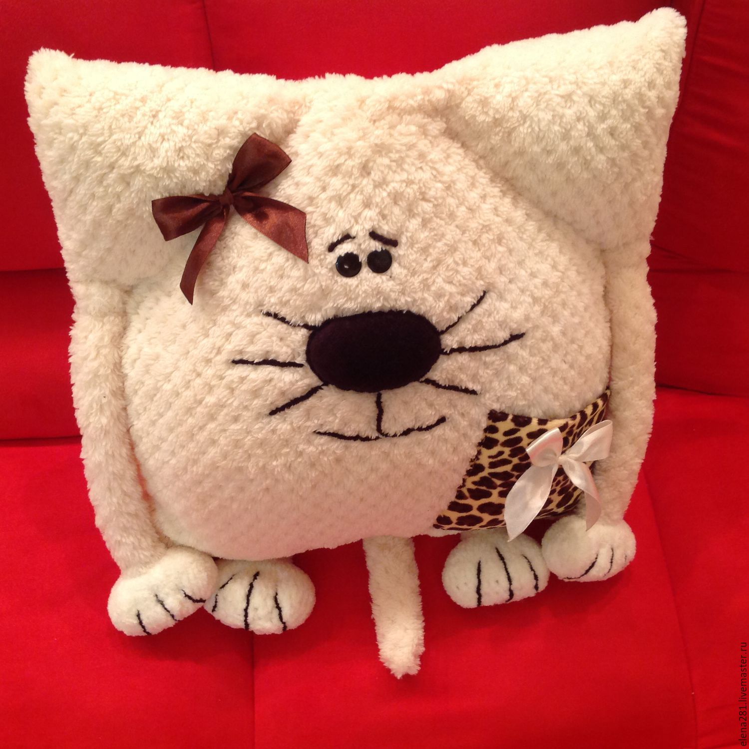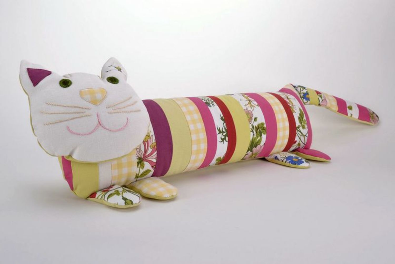 لكي لا تكون الوسادة مجهولي الهوية ، يمكن تنفيذها على شكل قطة سخيفة. بالإضافة إلى كمامة ، يمكنك أيضا تشكيل الكفوف والذيل. تقنية التنفيذ مذكورة أعلاه. الشيء الوحيد الذي يمكن التوصية به هنا هو خياطة عناصر العينين والأنف بغرزة متعرجة للتثبيت الآمن.