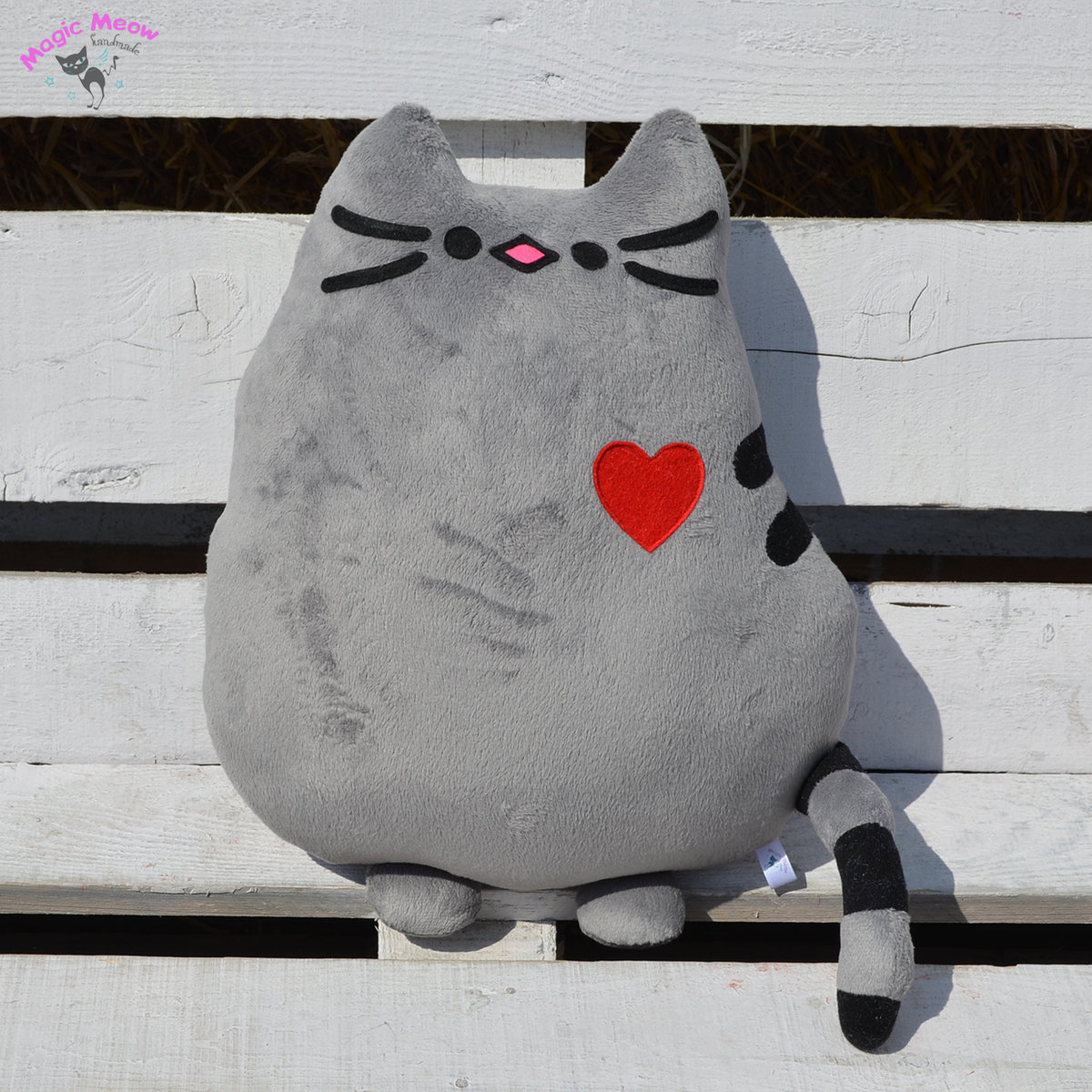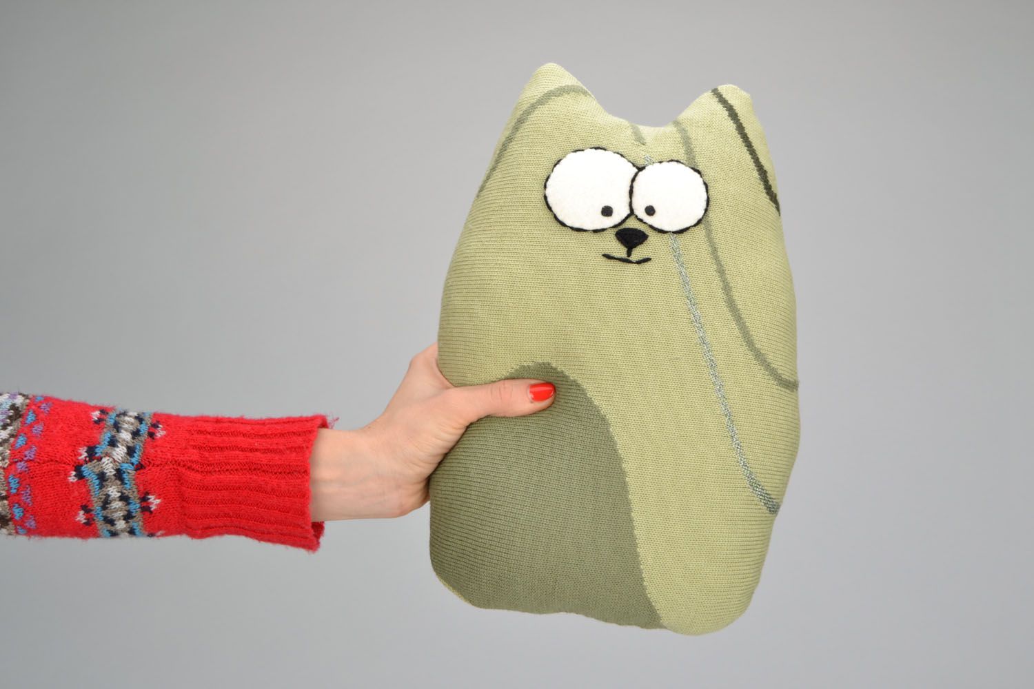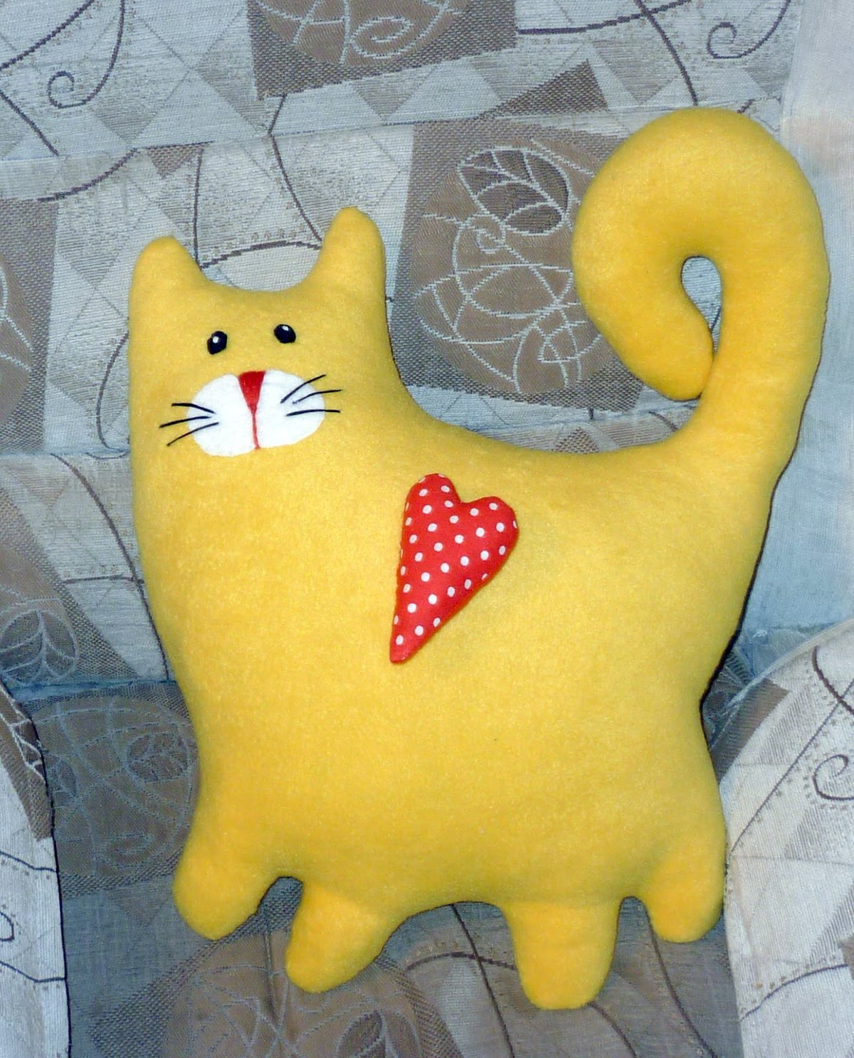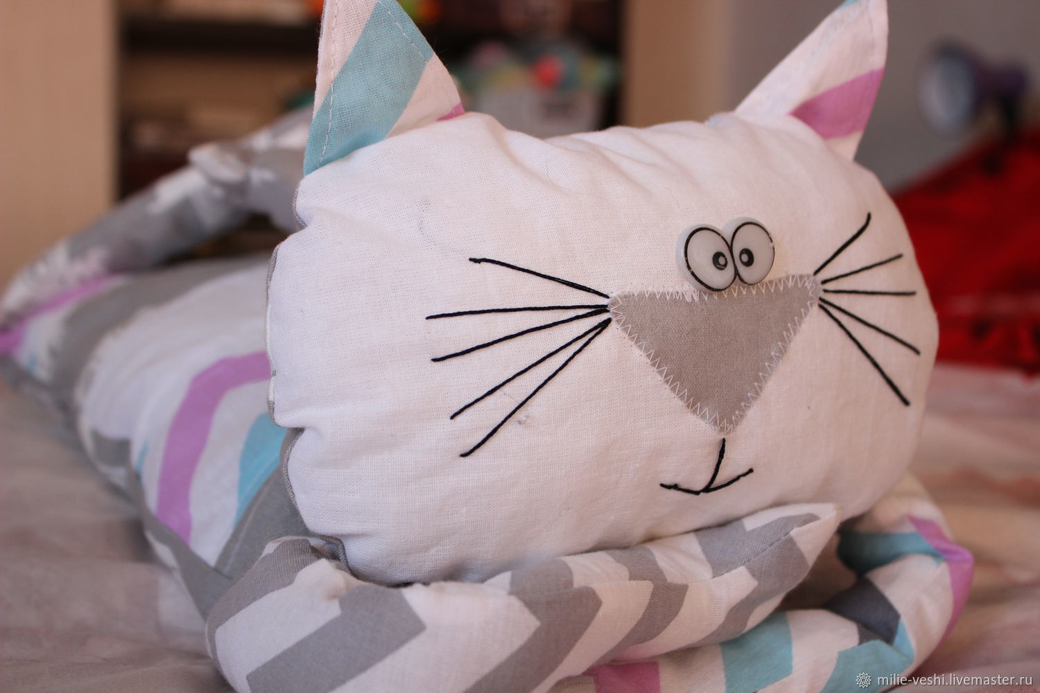 بعد ذلك ، تم تزيين الجانب الأمامي من الوسادة بأنف وعين القط ، وكذلك شارب.