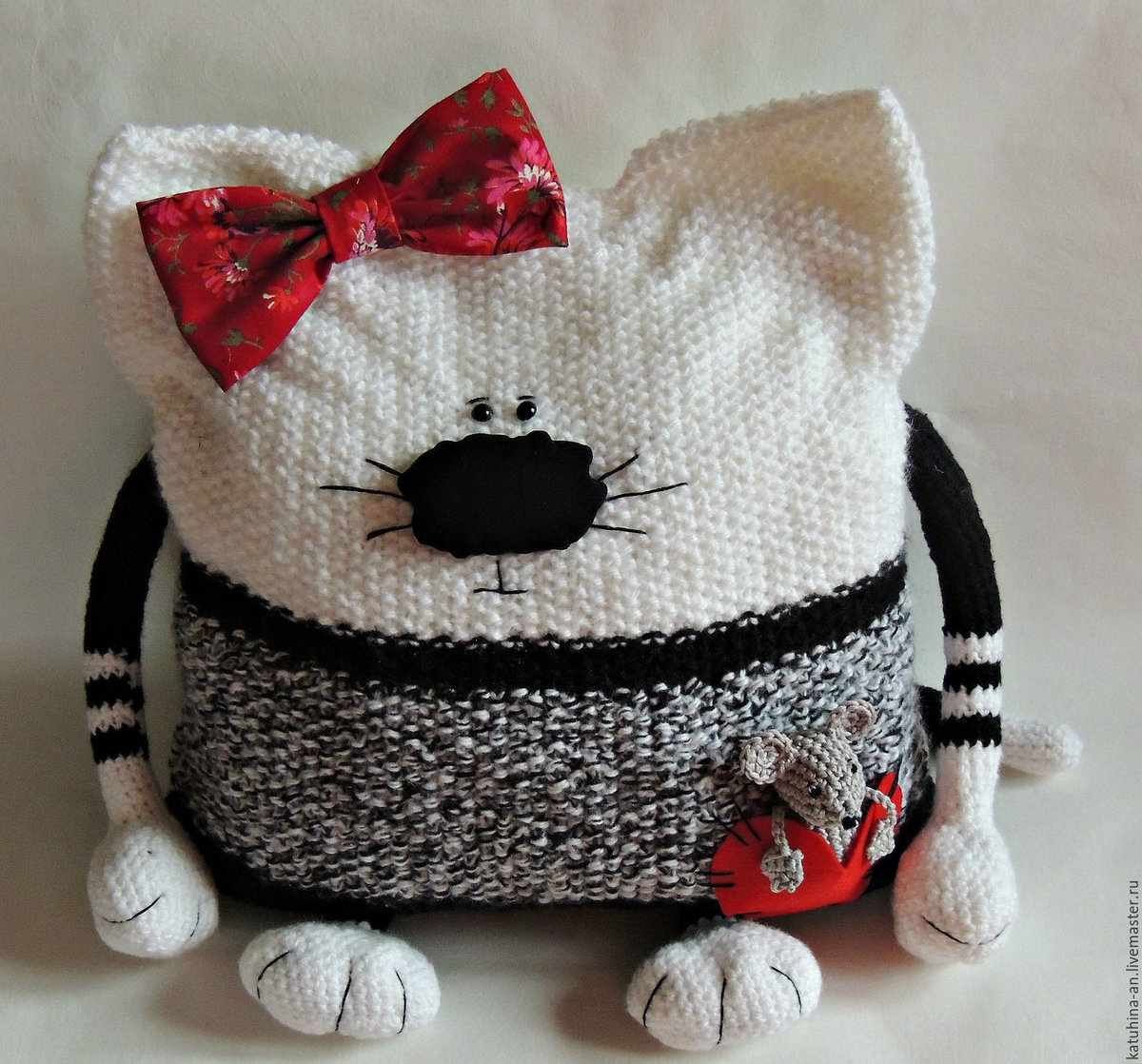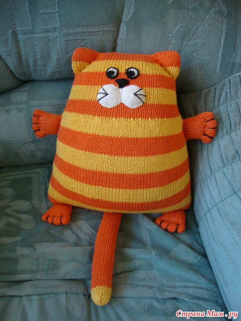 قماش محبوك مستطيل. يجب أن يكون عدد الحلقات مساوياً لعرض الوسادة. بعد ذلك يمكنك تحريك أو نعومة الوجه ، أو نقش اللؤلؤ على ارتفاع يساوي ارتفاعين للوسادة. بعد توصيل الطول المرغوب فيه ، يتم إغلاق الحلقات ، ويتم طي القماش بنصف اللون ومخيط من ثلاثة جوانب. ولكن قبل الانتهاء من التماس ، تحتاج إلى إضافة حشو. يتم خياطة الساقين الخلفيتين على الجانب السفلي من الوسادة ، في حين أن الجبهة إلى الجانب. قد تكون مرتبطة أيضا الكفوف ، أو قد تكون مصنوعة من القماش.