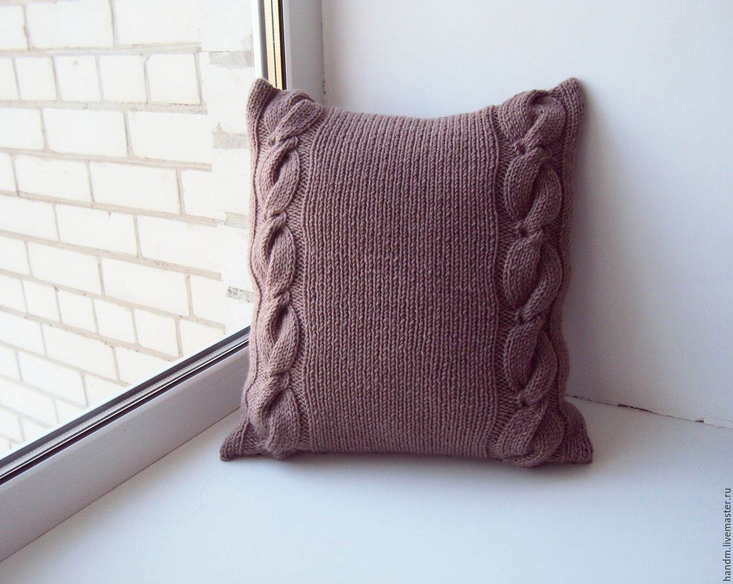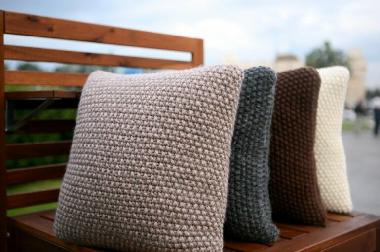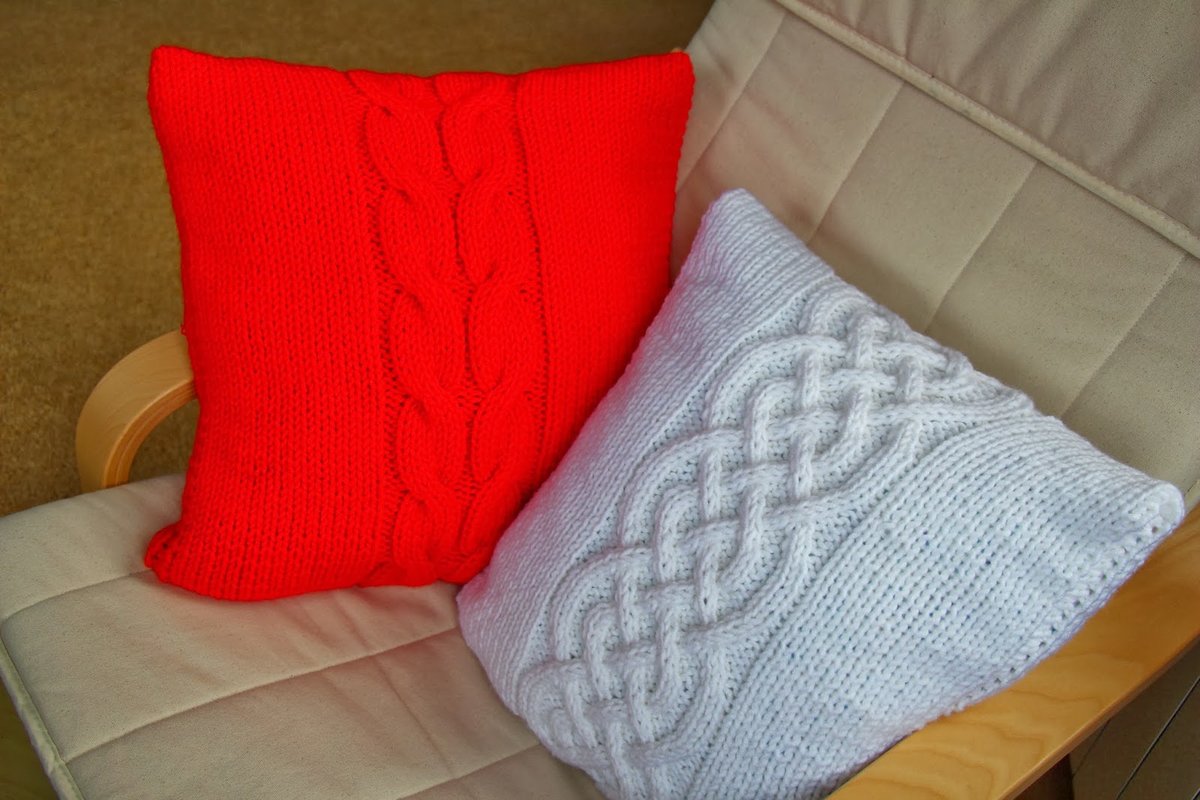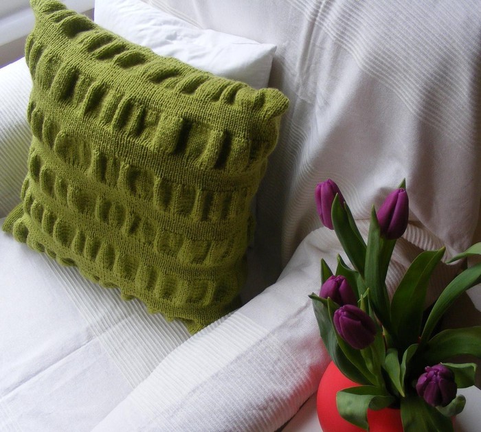 وسادة مع "المقابض" الإغاثة هي فكرة مثيرة للاهتمام على حد سواء. لعمل "كتلة" من إحدى الثقوب ، فإنها تصنع ثلاثة ، وبعد ذلك يتم تدوير العمل مرتين ، على الجانب "الأمامي" ، تُحبك الحلقات الأمامية ، على الجانب الخطأ - الجانب الخطأ. بعد 4 صفوف ، يتم طرح الحلقات الإضافية مرة أخرى ، الحياكة واحدة ، يتم توزيع "المطبات" بالتساوي على السطح بأكمله. يتم الحصول على راحة بسيطة من الضفائر المحبوكة بحلقات الوجه. العرض الأمثل لمثل هذا "جديلة" هو 6-8 حلقات ، وطول كل "رابط" هو 10-12 صفوف.