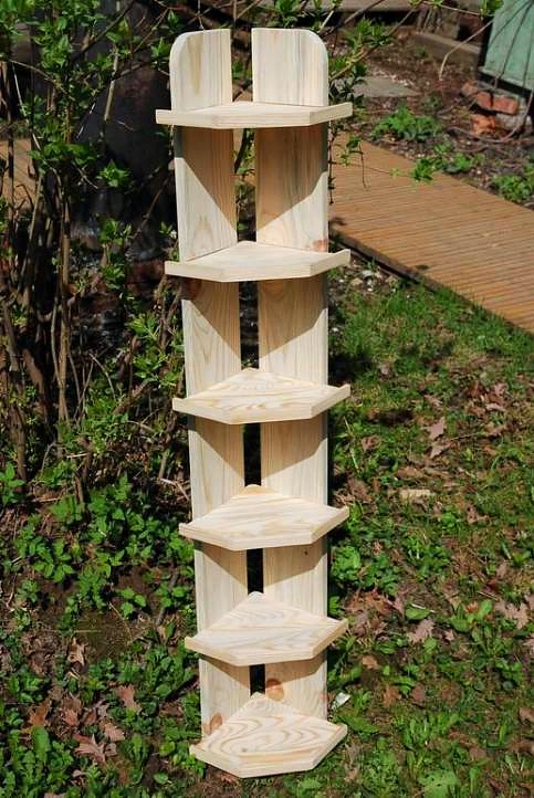 لتوفير مساحة في الغرفة ، يمكنك عمل رف زاوية للبنفسج والزنابق.مراحل إعداد المواد هي نفسها تقريبًا كما هي الحال في بناء خزانة حائط تقليدية. ولكن هناك فارق بسيط. يجب قطع نهايتي الأجزاء العلوية والسفلية بزاوية.