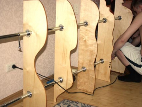 لتصنيع الحرف اليدوية ، تحتاج إلى تدريبات منتظمة بحفر كبير. في كل رف تحتاج إلى عمل فتحتين. يجب أن تكون موازية لبعضها البعض. بشكل عام ، اتضح ، فتحتين لكل قطعة. يجب أن يكون الثقب حراً لدخول الحبل السميك. إذا كانت الثقوب أصغر ، فهناك احتمال أن يكون الجرف هشًا.