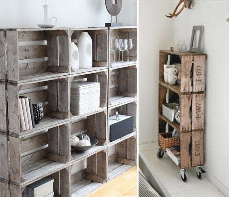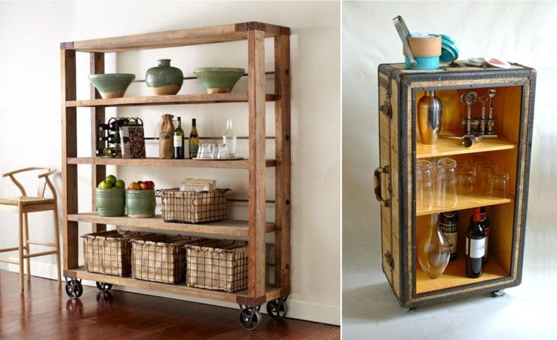 رفوف خشبية تمنحك مساحة أكبر للديكور. ستحتاج إلى مواد غير مكلفة وأدوات بسيطة: الطلاء الأكريليكي والورنيش وورق الصنفرة وتلميع الشمع. قبل تجميع الحامل على الرفوف الخشبية والأرفف ، يمكنك وضع وصمة عار ، والتي ستسمح بتحقيق الظل المناسب للداخلية والتأكيد على هيكل الأشجار. يمكن تزيين الرفوف أو الجدران الجانبية باستنسل ، أو يمكنك تضمين الصور التي تريدها على ورنيش أكريليك. في النهاية ، يمكن تغطية الحامل بشمع أثاث ، مما يعطي لمعانًا ناعمًا وسيحمي رفك من الرطوبة.