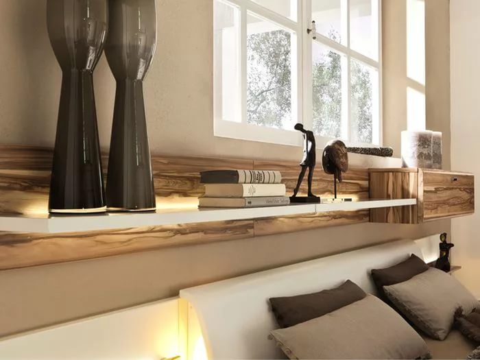 رفوف فوق السرير — إنه ملحق أثاث حديث يمنح الغرفة طابعًا خاصًا ويخدم كإضافة رائعة للتصميم العام لغرفة النوم. تعويض عن مساحة متواضعة من الغرفة ، وظيفتها ليست أدنى من الجداول بجانب السرير.