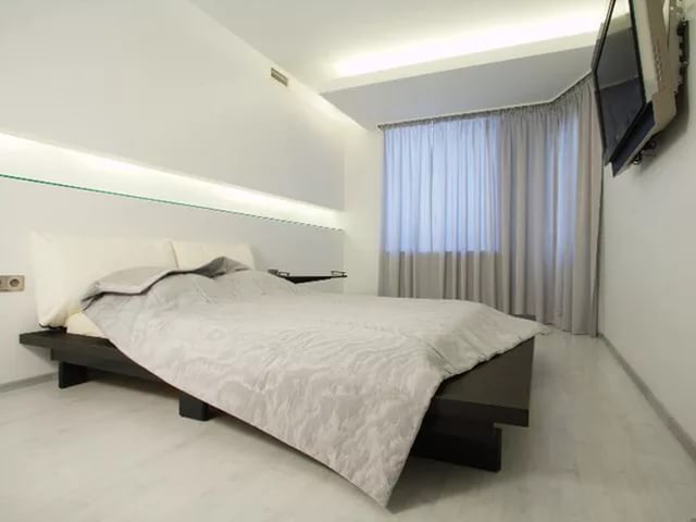 الجرف الموجود فوق السرير هو الحل الأصلي لتصميم الجدران في غرفة النوم.