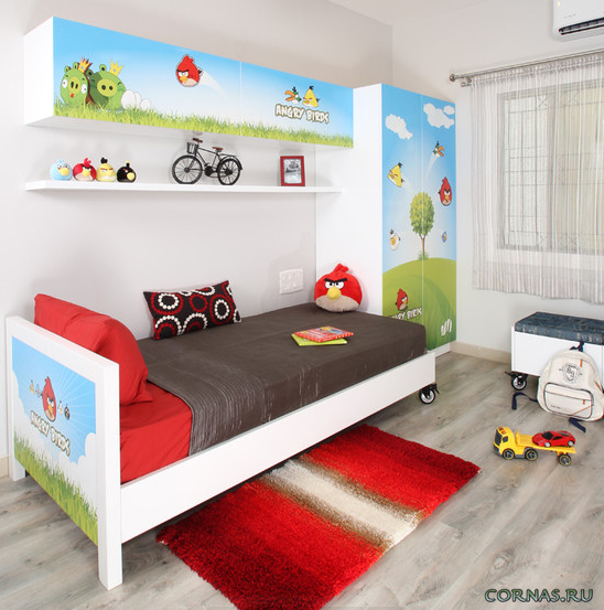 في الحضانة ، يمكنك أيضًا تثبيت أرفف فوق السرير.