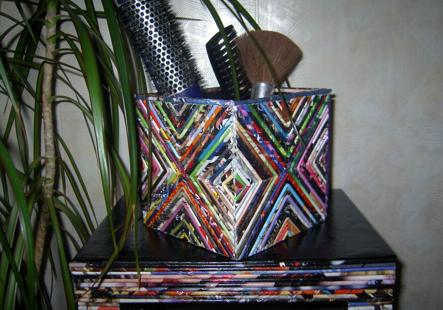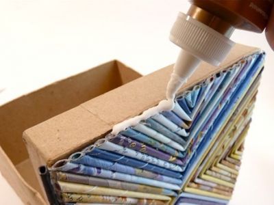 صفحات المجلات مقطعة إلى شرائح بعرض يتراوح بين 1-2 سنتيمترات ، ثم لف الأنابيب بقلم رصاص رفيع أو إبر تريكو. على الورق ، إذا أخذنا كأساس ، قم بلصق القش اللامع الناتج على التوالي. ثم قص ورقة الأنابيب في عرض مناسب يتوافق مع مكان الديكور ووضعها على الغراء. عندما يجف السطح جيدًا ، قم بتغطيته بورنيش الأكريليك.
