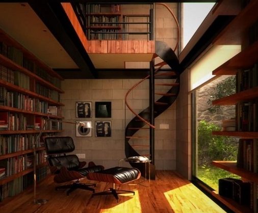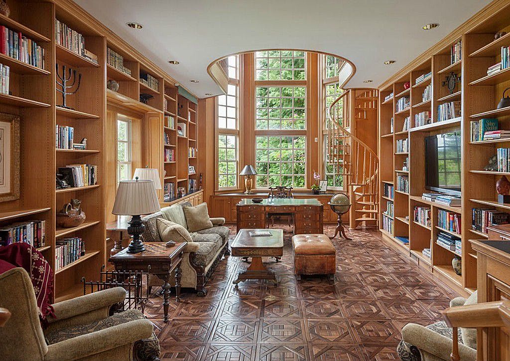 بالنسبة للأثاث ، يمكن أن تكون أرفف كتب في الحائط بأكمله ، أرفف ، خزائن ، إذا كانت المكتبة في منزل خاص ، فيمكنك ترتيبها على الدرج. اختياريا ، أكمل التصميم مع الأرفف والوحدات والأقسام. الشيء الرئيسي هو أن نأخذ في الاعتبار أن عمق الرفوف كان 22 سم ، ثم يمكنهم استيعاب كتب أكبر من الكتب التقليدية ، وكذلك نسخ كبيرة. الآن تصنع الأرفف تحت أي جدار ، يمكن أن تملأ الفراغ في المنزل ، على سبيل المثال ، الجدار الموجود فوق المكتب. يملأ الرف الدوار الزاوية تمامًا. كل هذا يتوقف على الخيال.