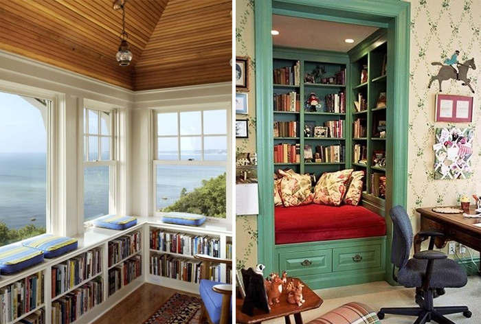 مكتبة منزلية مريحة صغيرة بها مكان للقراءة