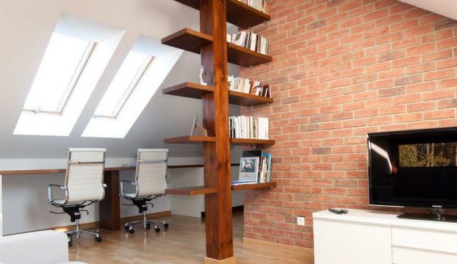 يقوم الكثيرون في المنزل بتجهيز الغرفة تحت المكتب أو تخصيص زاوية أسفل مكان العمل. ولكن يحدث أن الغرفة لا تحتوي على نوافذ ، وتقع منطقة الأعمال في الزاوية. في هذه الحالة ، يمكنك وضع أرفف الكتب. هذا سيعطي المكتب أسلوب عمل. لكنه لن يكون مجرد مكتب ، بل سيكون غرفة مريحة ، حيث ستعمل وترتاح.