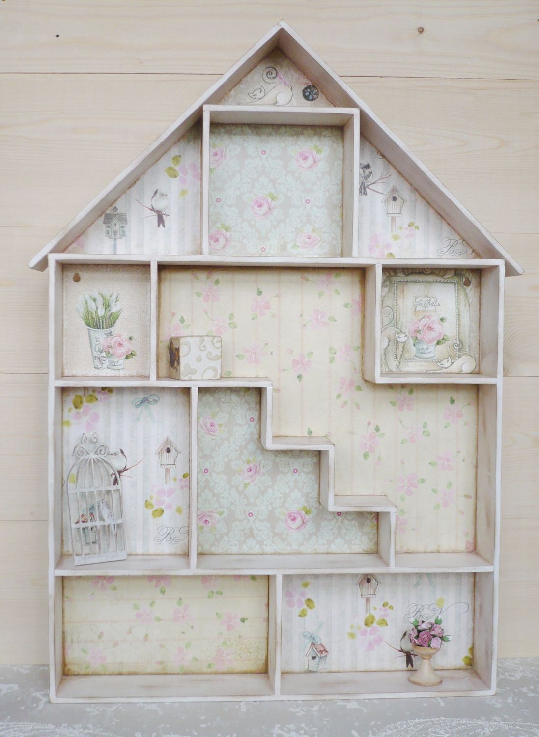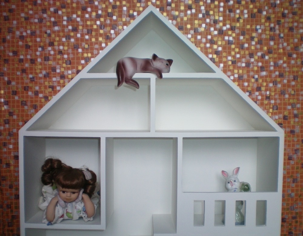 طفل أرفف المنازل - المنتجات التي تحاكي الجدران والسقف الثلاثي للمبنى. هذا هيكل مفتوح ، يوجد بداخله العديد من الأرفف التي تربط الجدران الجانبية. ربما تقسيم الفضاء بين الرف إلى أقسام.