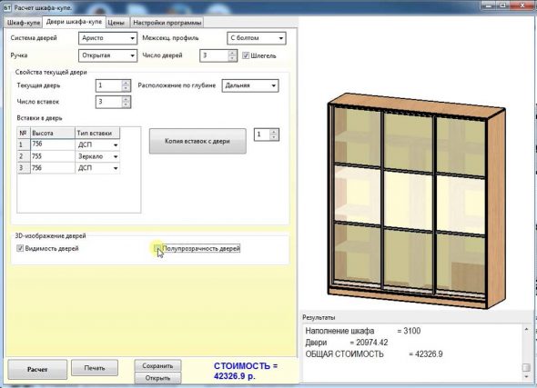 مثال على حساب سعر خزانة الملابس في برنامج CupeCalc v1.0 ، الذي بني على أساس Microsoft Excel باستخدام وحدات ماكرو VBA