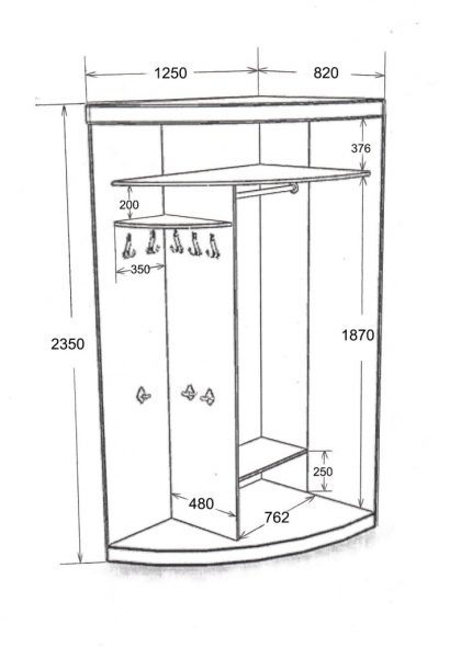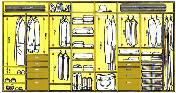 لا يمكن أن يكون العمق أقل من خمسة وستين سنتيمترا. مع عمق أقل من الصعب وضع الأشياء. حجم الشماعات دون ملابس هو اثنين وخمسين سنتيمترا. شماعات الملابس تشغل خمسة وستين سنتيمترا. يجب أن تكون الأبواب المغلقة خالية من دون جهد. عند حساب الأبعاد ، فكر في سمك المادة المستخدمة في صناعة الأثاث. الجدران السميكة تقلل من حجم الجهاز.