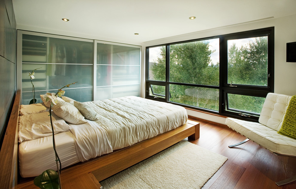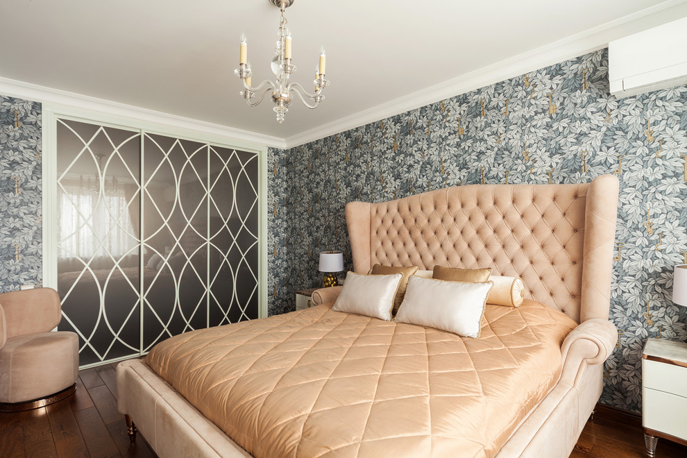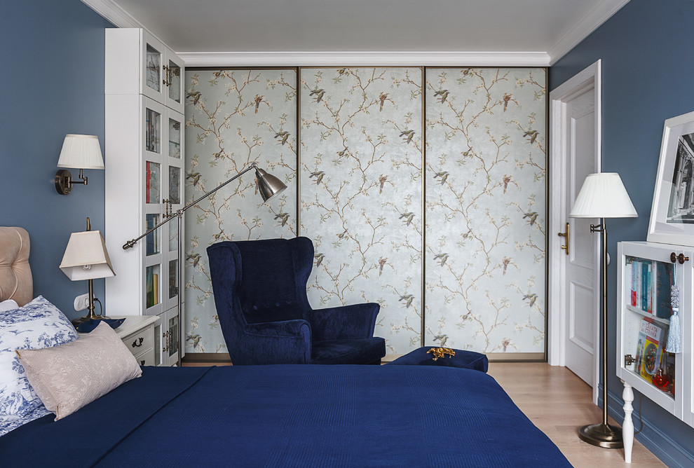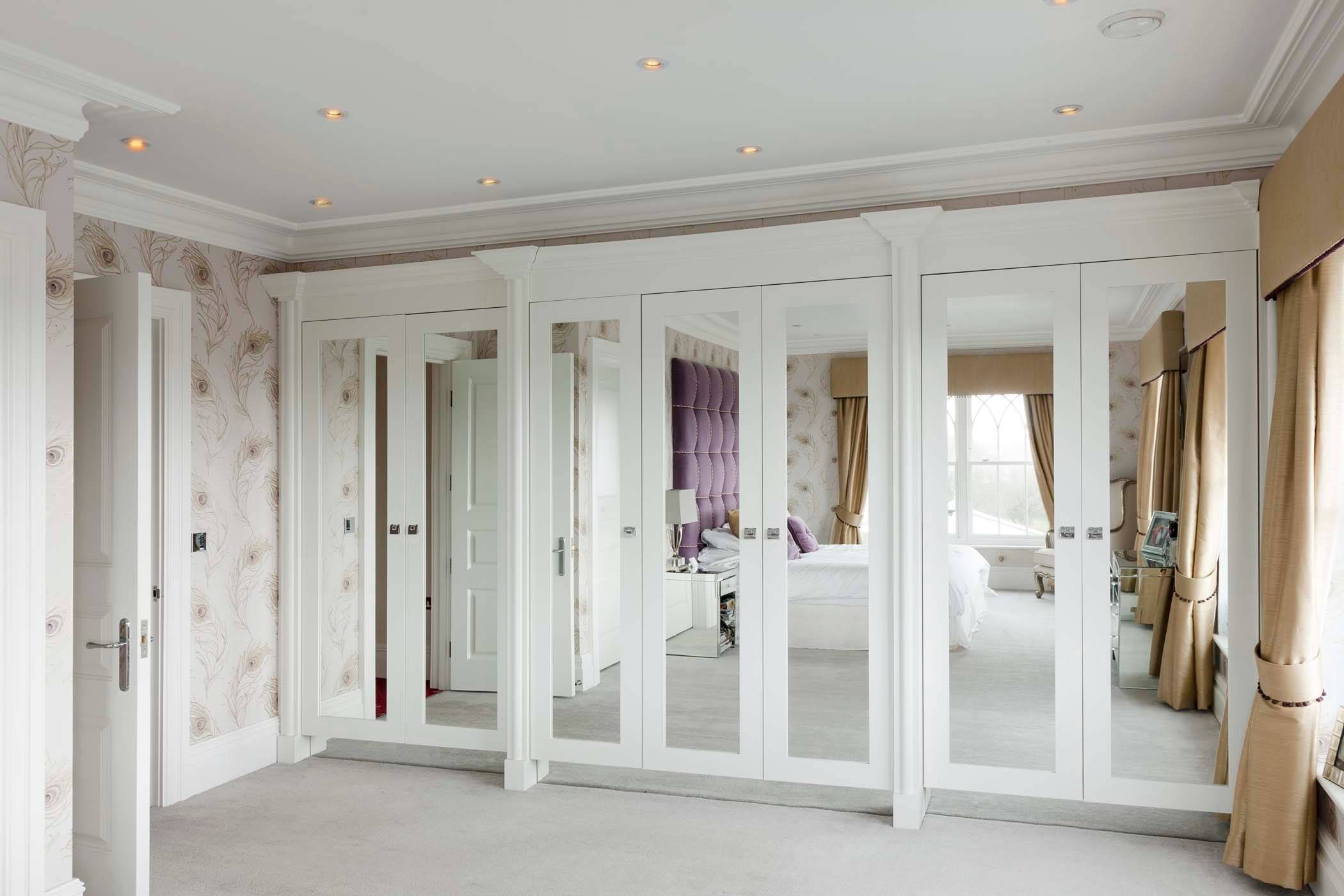 خزانة ملابس واسعة على الحائط بأكمله في غرفة النوم الكبيرة - استبدال شبه كامل بغرفة ملابس منفصلة.