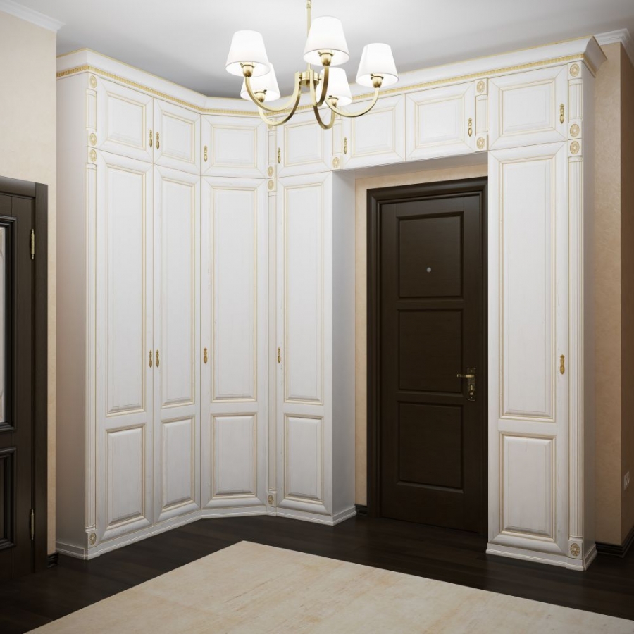 في كثير من الأحيان ، يتم تصنيع خزانة الملابس في زاوية الغرفة. لا يحتوي هذا الطراز على جانب واحد وجدار خلفي (وفي بعض الحالات لا يوجد أرضية وسقف).