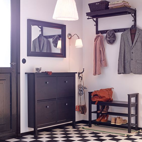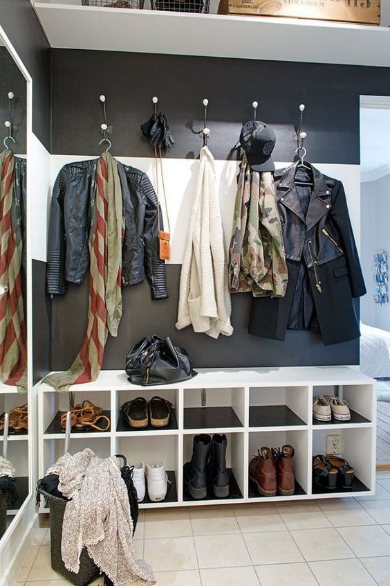 الحل الجيد هو الجمع بين خزانة الأحذية وعناصر خزانة الملابس. أو ضعها في خزانة أو خزانة زاوية ، والتي لها واجهات مفتوحة.