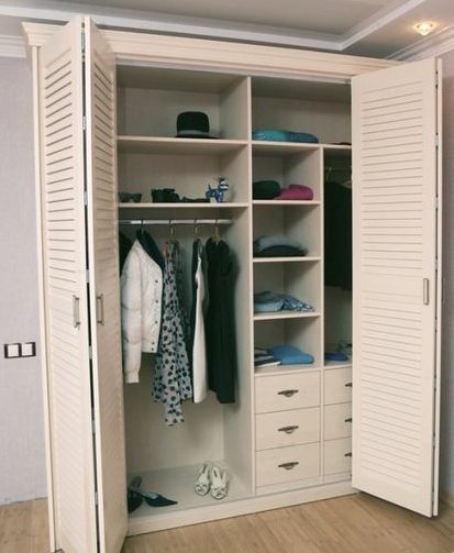 سيكون الحل الأمثل لمثل هذا الأثاث مكانًا متميزًا بنظام انزلاق ، مزود بعدة أرفف ، وقضبان متقاطعة. تركيب الأغطية في هذه الحالة هو نفس تركيب الأبواب الداخلية (الجدران والأرضيات).