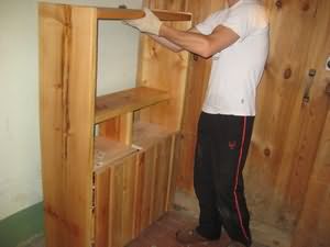 يتم وضع صفائح الخشب الرقائقي أو الألواح الخشبية أو الألواح الصلبة ، والتي يتم التخطيط لاستخدامها في الإطار الهيكلي ، وفقًا للرسم ويتم ربطها بالأظافر والغراء. الجزء الخلفي للخزانة مغطى بخشب رقائقي رفيع (يصل إلى 1 سم) ومرفق به أيضًا بالمسامير والغراء.