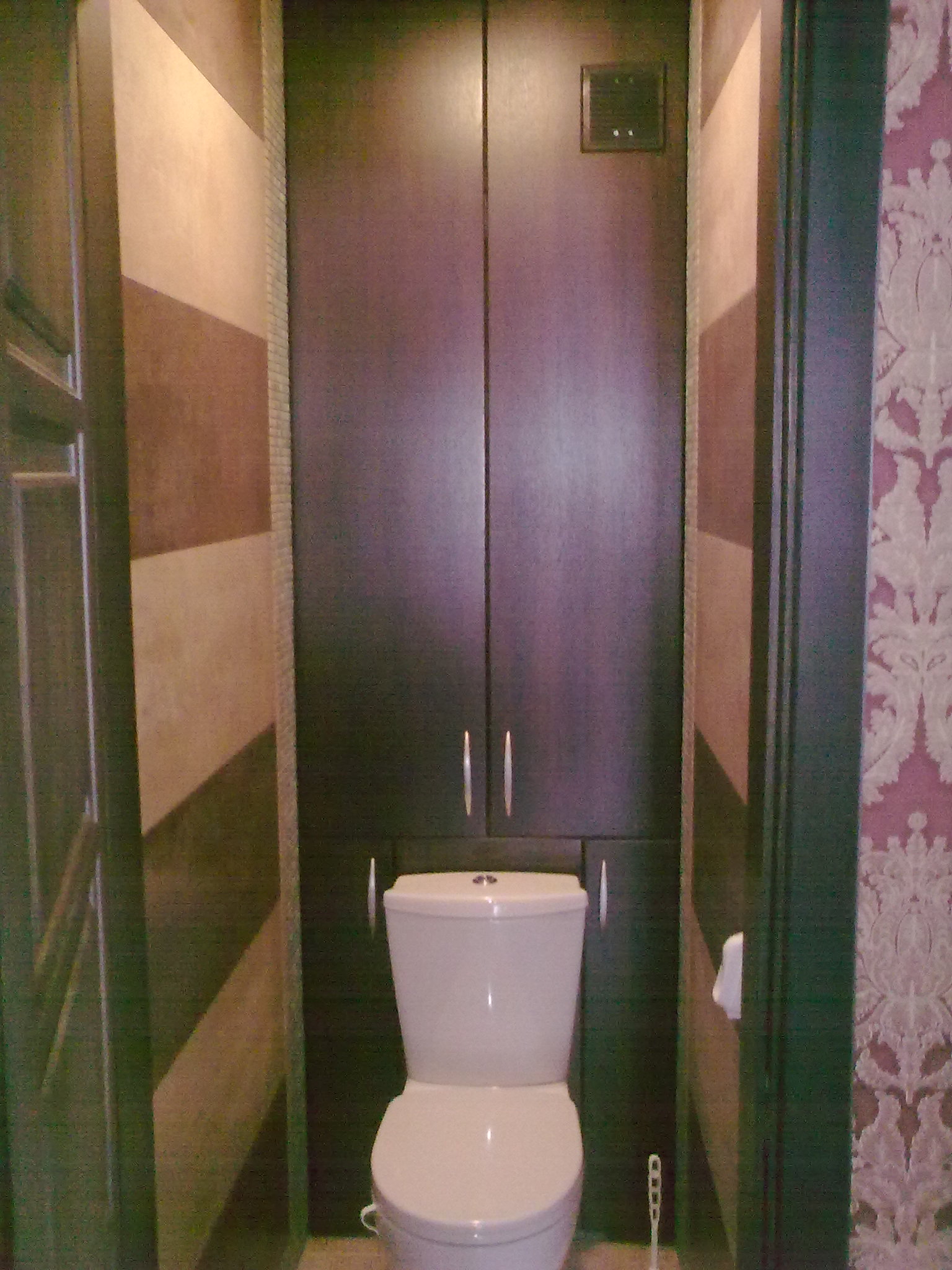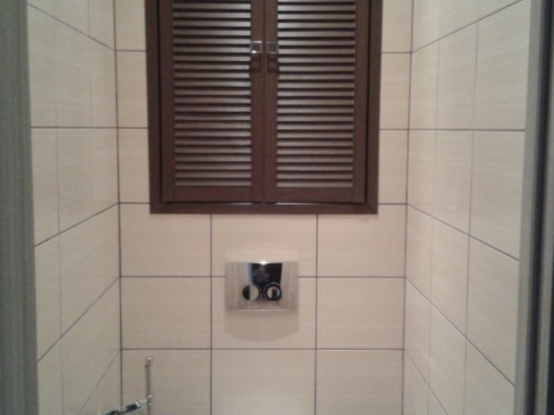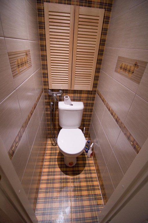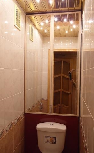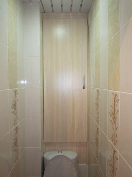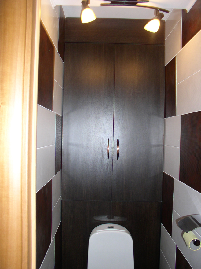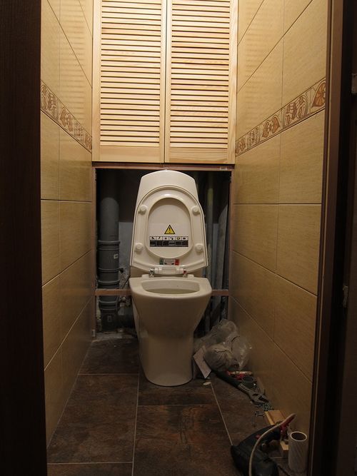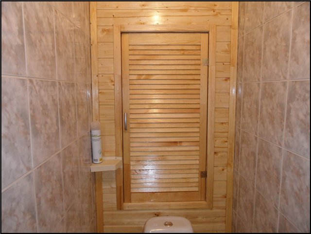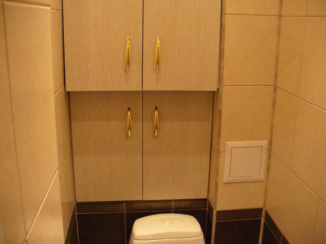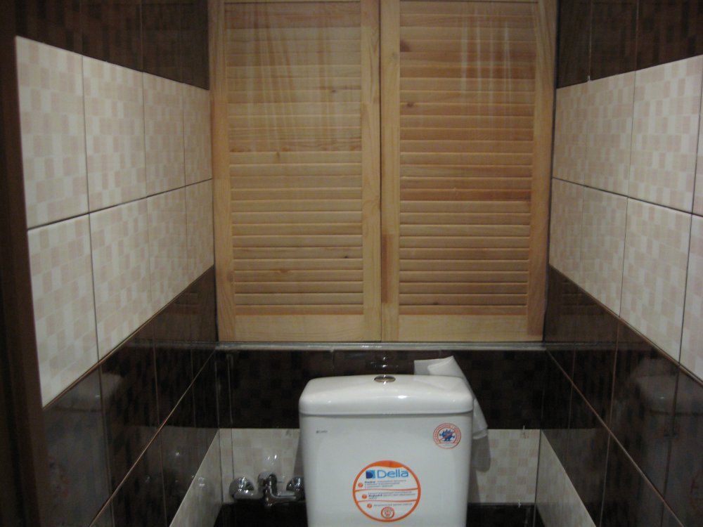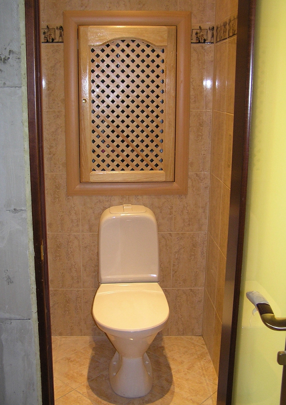 بالإضافة إلى ذلك ، إذا كان هناك بلاط في المرحاض ، يمكنك استخدام ألواح بسيطة من الخشب الرقائقي ، والتي يتم لصقها بعد ذلك بنفس البلاط المركب على جدران الحمام.