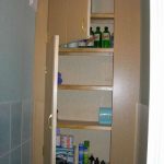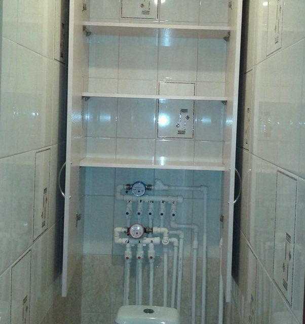 يمكن جعل الأرفف مفتوحة أو مغلقة ، وتقع داخل الهيكل. عند تركيب الرفوف ، من الضروري مراعاة ارتفاع عبوات المنظفات القياسية وكتل الورق القابلة للارتفاع وارتفاع حامل الملابس القطنية ومواد التواليت الأخرى والإكسسوارات المنزلية. من الأفضل أن نسعى جاهدين لعمل مثل هذا التصميم حتى يتسنى لكل شيء يحتاج إلى إخفاء أن ينسجم بشكل متناغم مع المنافذ. يجب ألا تصنع أرفف على نفس المسافة بينها وتسعى جاهدة لتصميم متماثل للأرفف في ملء الخزانة. من الأفضل قياس المسافة لتركيباتها وفقًا لمجموعة الأشياء القياسية المتوفرة للتخزين في المرحاض.