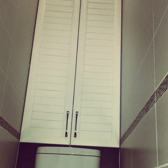 مادة مثيرة للاهتمام لمواجهة واجهة خزانة المرحاض هي مرآة. لديها خاصية مذهلة لتوسيع المساحة ، والتي قد تكون ذات صلة للحمامات الصغيرة. بالإضافة إلى ذلك ، يمكن أن يكون انكسار الضوء عبر عدسة مرآة أمرًا مثيرًا للاهتمام في المناطق الداخلية العامة.