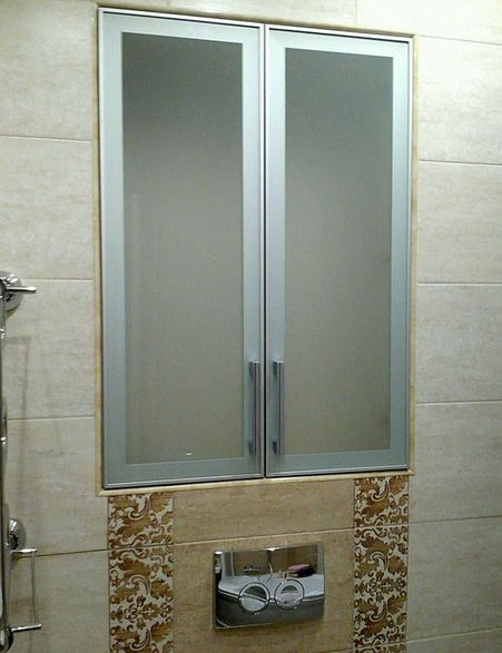 بالنسبة لأولئك الذين اعتادوا على مواد أكثر تكلفة ، يمكنك استخدام الزجاج بنجاح. نظرًا لتراكم الرطوبة في الغرفة الصحية ، فمن الأفضل اختيار الزجاج الملون بنهاية غير لامعة. عند قطع الزجاج ، من الضروري معالجة حافة الزجاج باستخدام تلميع خاص ، حتى تكون جميع الحواف ناعمة. مثيرة للاهتمام أيضا قد يكون نسخة من خزانة صحية مصنوعة من المعدن. يحب المصممون استخدام هذه المواد عند تصميم الديكورات الداخلية بأسلوب الدور العلوي.