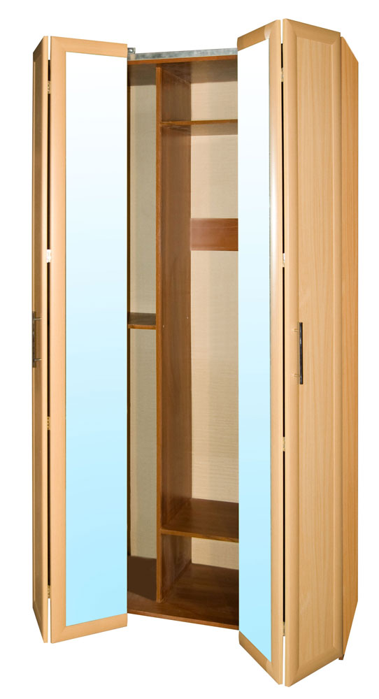 خزانة زاوية مثيرة للاهتمام مع أبواب بمرآة وأرفف مفتوحة