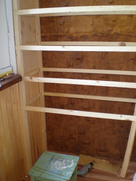 من الضروري استخدام قضبان الصنوبر. الأول هو جعل الإطار الخلفي. يتم ربط القضبان الأفقية بالعمود بخطوة 60 سم. للانضمام إلى الشجرة ، يمكنك استخدام الأظافر العادية. يجب أن يعلق الإطار على جدار الشرفة مع المراسي. بعد ذلك ، يمكنك إرفاقه بالإطار الخلفي للسكة (الطول يساوي العمق المستقبلي للخزانة). يتم إصلاحها في الزوايا اليمنى مع زوايا معدنية. ثم بنفس الطريقة يتم إنشاء الإطار السفلي (الإطار السفلي). يجب أن تعلق جميع الجدران وأسفل الهيكل على جدران الغرفة مع المراسي.
