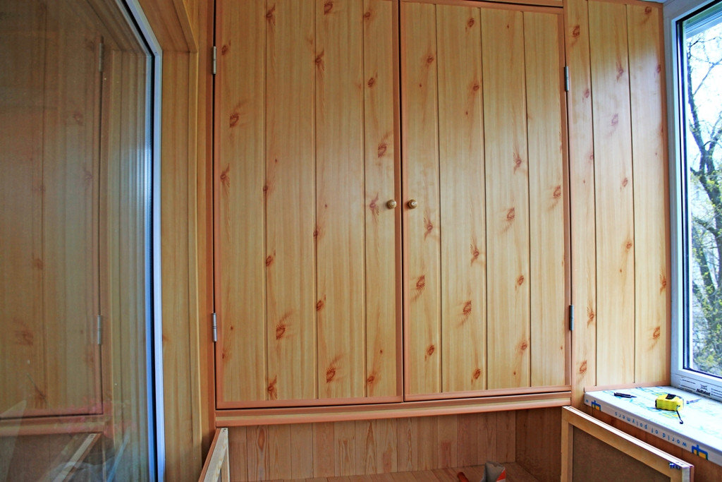 يمكن ترك خزانة ملابس من لوحة الحائط كما هي ، إذا كان تصميم الشرفة يحتوي أيضًا على عناصر خشبية من الديكور. ومع ذلك ، لإطالة عمر الخزانة ، يجب تغطيتها بورنيش واقي. قبل ذلك ، من الضروري تفريغ جميع الأسطح الخشبية تمامًا ، وبعد ذلك فقط يتم تلبيسها بالورنيش بعدة طبقات.