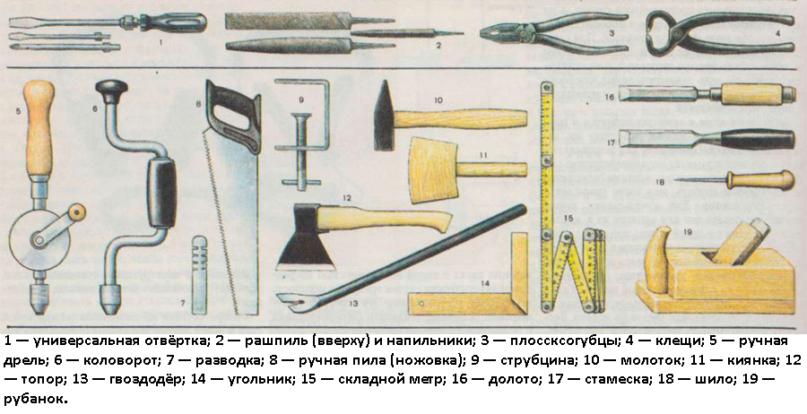 - الروليت البناء ، قلم رصاص ، المستوى ، مفك البراغي ، المطرقة ، handaw و ثقب.