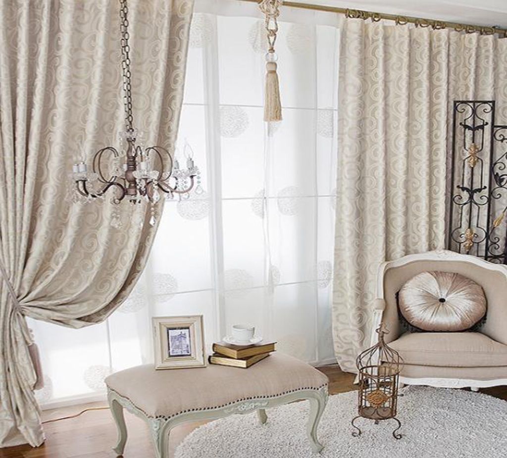 ثلاثة أنواع من الستائر في نافذة واحدة: الستائر الخفيفة شبه الشفافة ، والستائر المعتمة الثقيلة والستائر الخفيفة المزخرفة على كامل التكوين