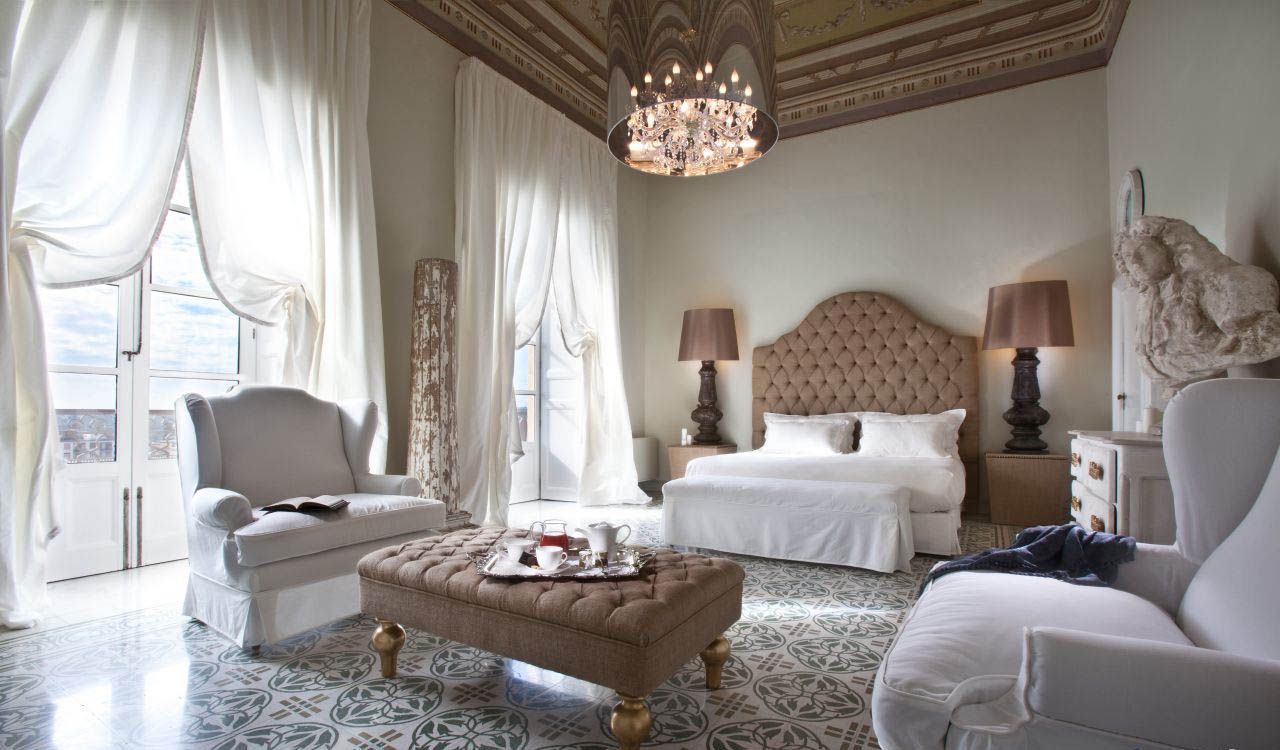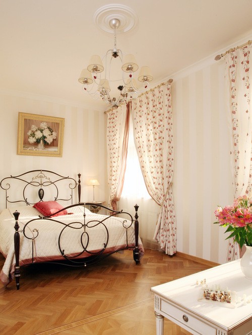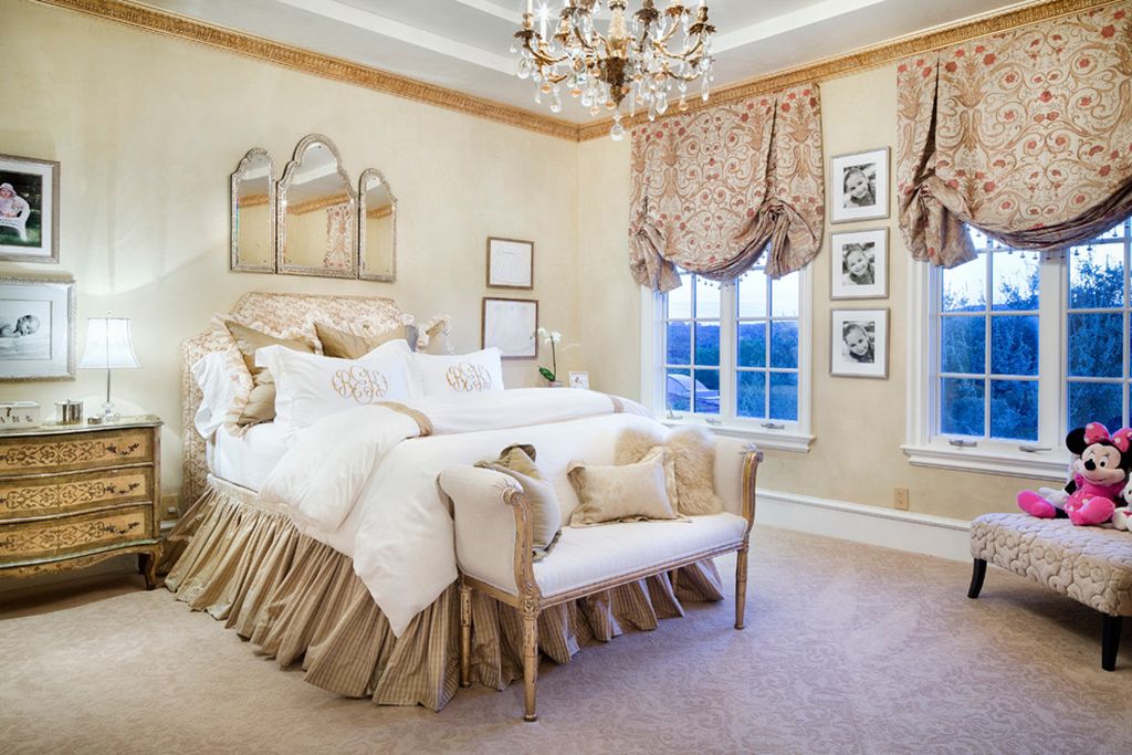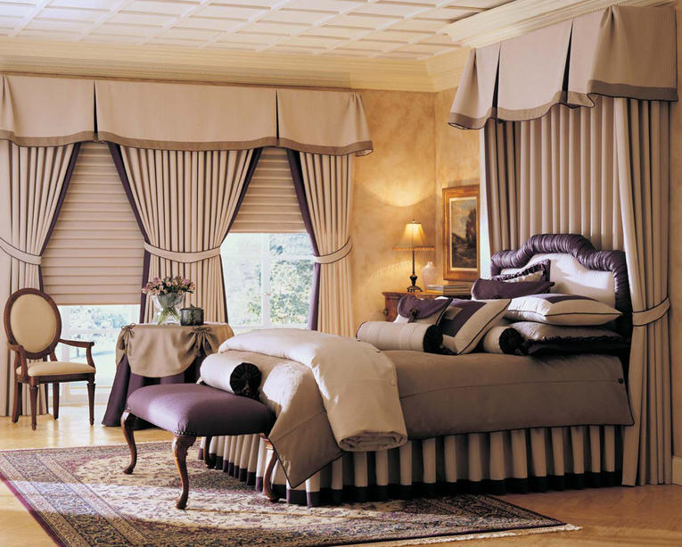 غرفة نوم على الطراز الكلاسيكي مع نسيج رقيق وستائر كلاسيكية بلونين