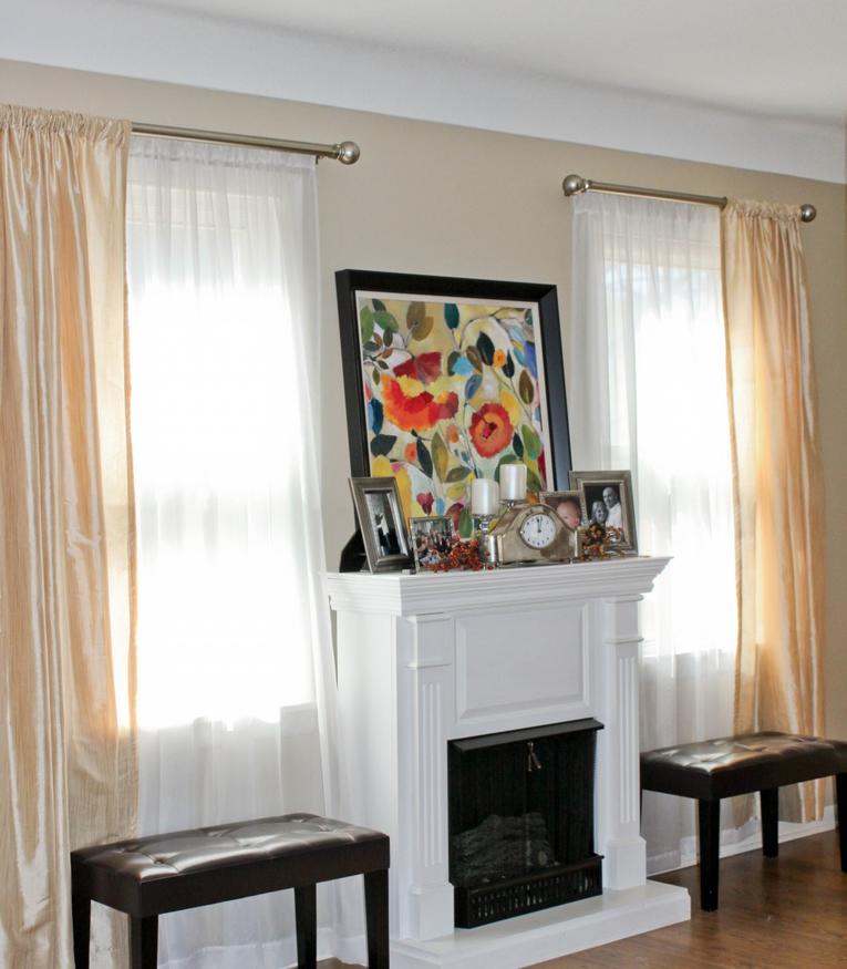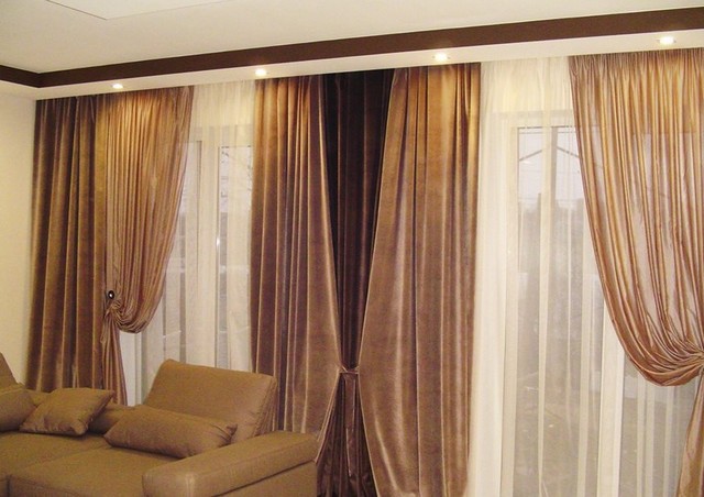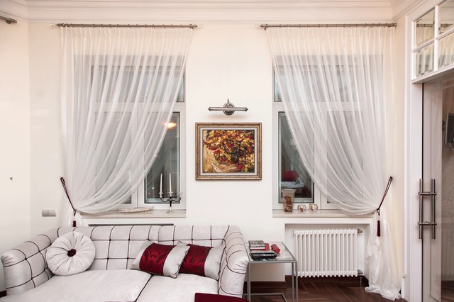 بدلاً من الستائر الخفيفة ، يمكنك تثبيت الستائر الرقيقة الأنيقة المغطاة بالستائر الطويلة.