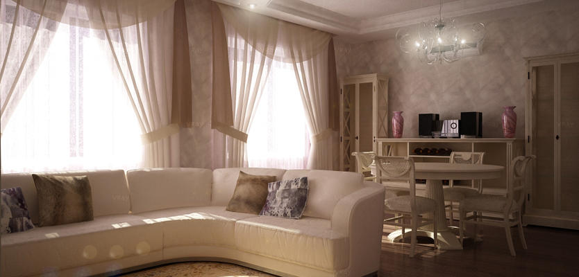 يعتبر المصممون ذوو الخبرة أن استخدام الستائر والستائر المستقيمة من الأقمشة الخفيفة الوزن هو الأنسب.