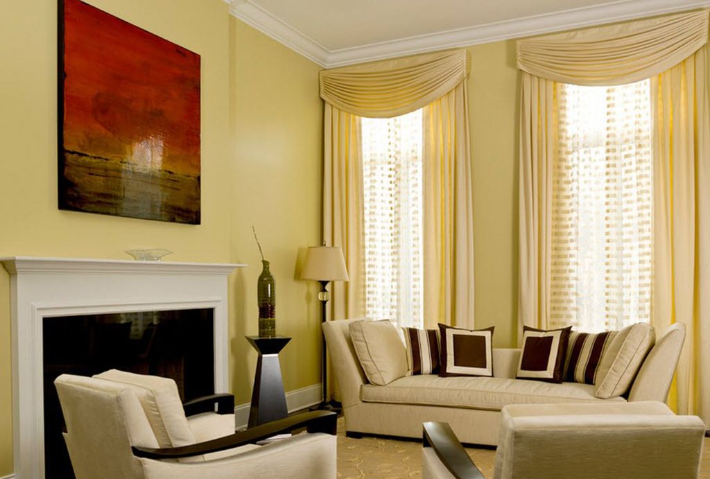 مزيج كلاسيكي بأسلوب عصري - تم تزيين الستائر على نافذتين بتول عريض مع لوحين يزينان بشكل متناظر على كلا الجانبين