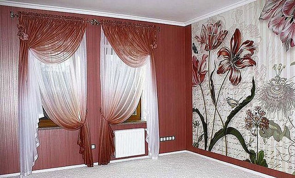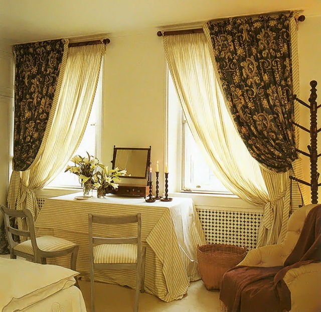 يمكن تزيين نافذتين على أحد الجدران ، مفصولة بجدار ، بشكل مختلف ، حسب عرضه.