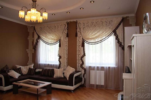 ستائر غرفة المعيشة: خيارات التصميم لنوافذين في الغرفة