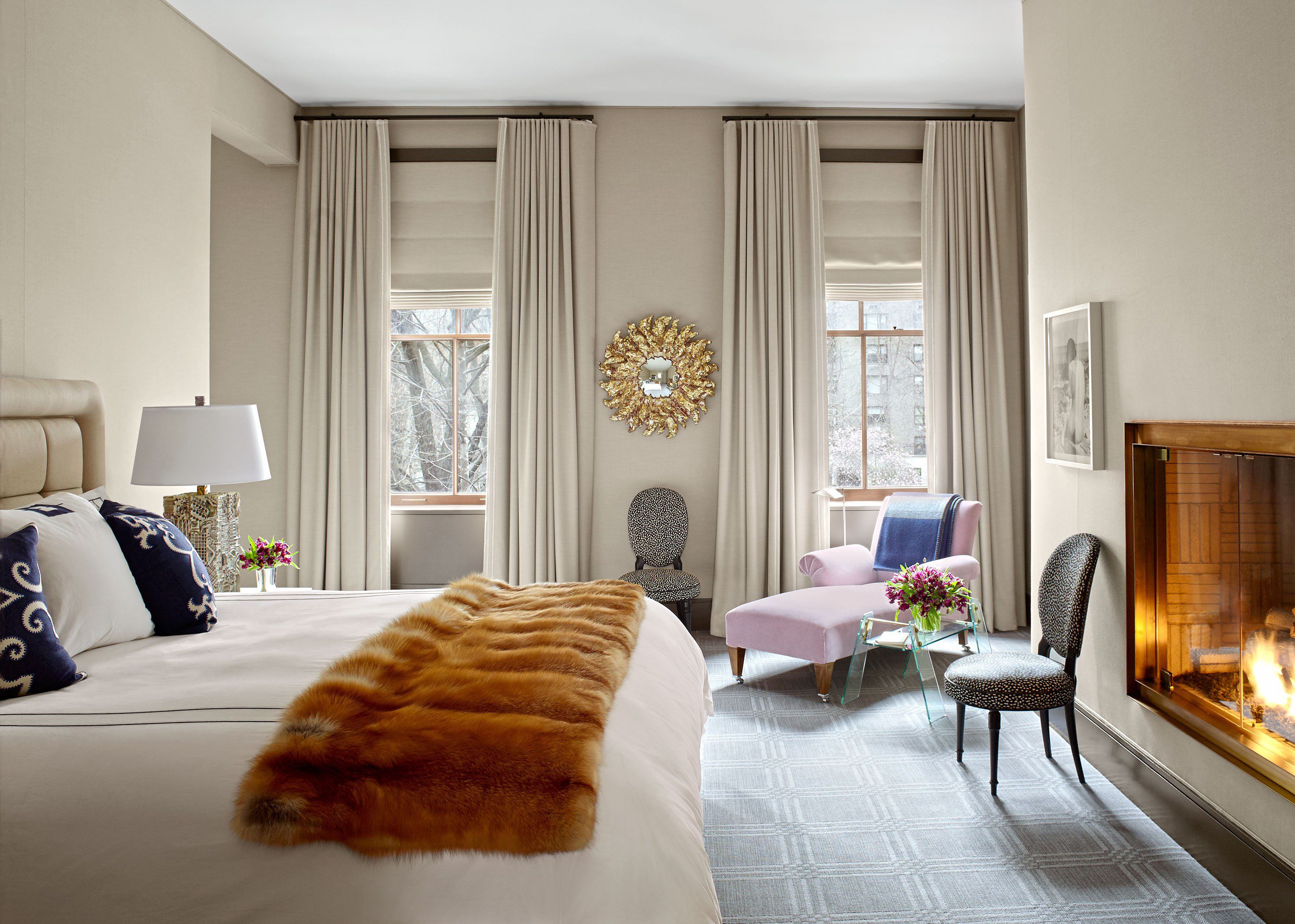 غرفة نوم مع نوافذ كبيرة قبالة بعضها البعض ، مزينة بتول شفاف منقوش