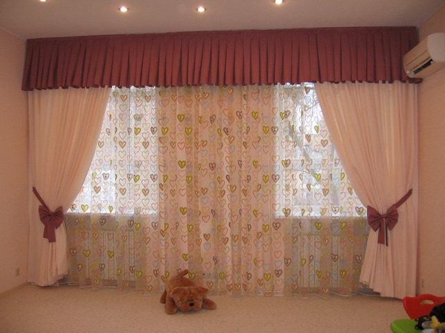 قد يكون هناك خيار آخر وهو ما يسمى بتصميم المرآة ، عندما تفتح فتحات النوافذ بنفس الستارة المطبوعة. كملحق يمكن استخدام لامبريكين ، وربط كل من الطنف ، وتشكيل مظلة مريحة.