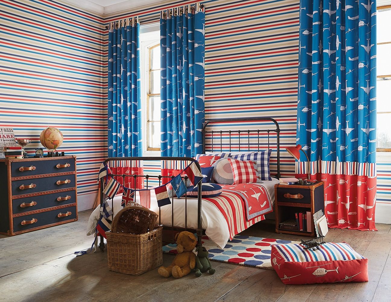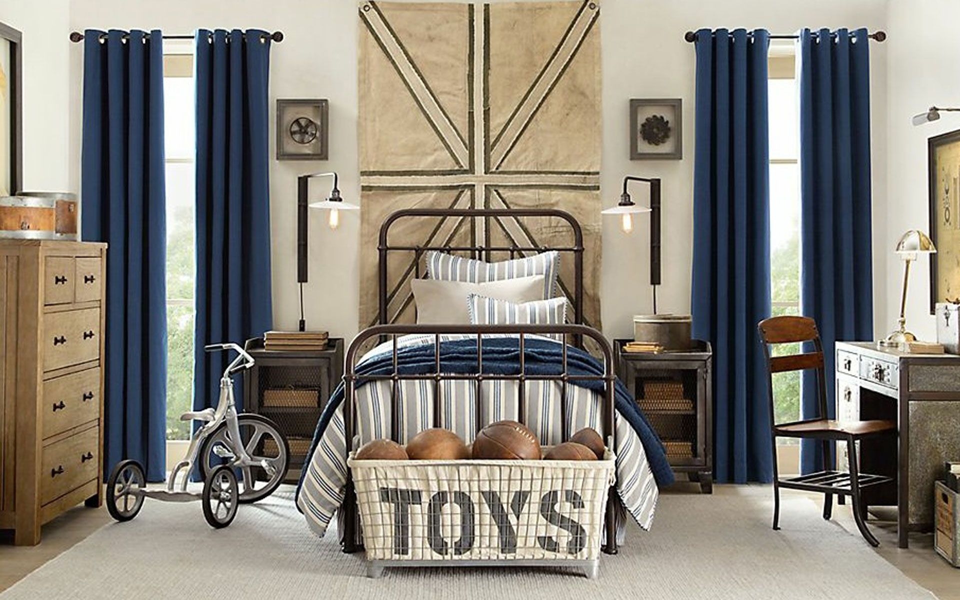 الستائر الدوارة المزخرفة الجميلة تجعل من الداخل غرفة نوم مع اثنين من النوافذ أكثر إثارة للاهتمام.
