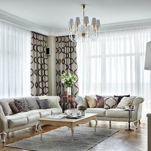 - كلاسيكي يجمع بين أجود ستائر الأورجانزا مع طيات خفيفة مع ستائر سميكة ، يمكن أن تكون مستقيمة أو مطبوعة. استخدام الستائر الرومانية سيكون ناجحاً.