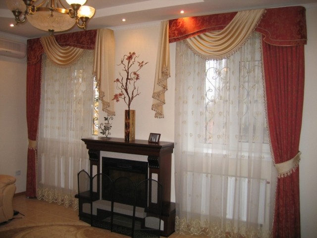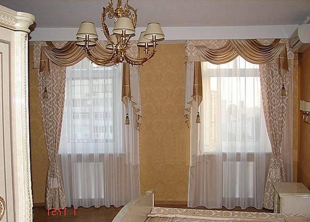 مزيج كلاسيكي من الستائر متعددة الطبقات - ستائر مع نافذتين ، مزينة بتول عريض واثنين من قماش متماثل ، تستخدم أيضًا لامبريكين صلب يختبئ الطنف