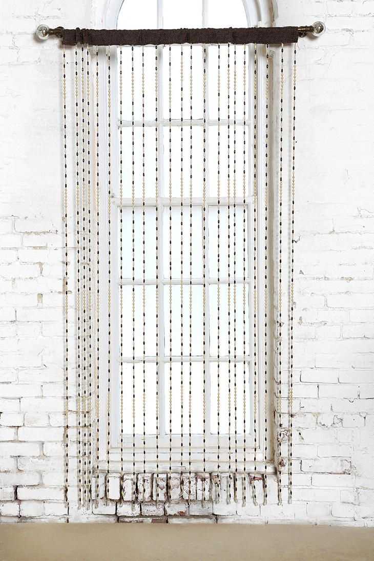 يمكن شراء سلسلة من الخرز للستائر الزخرفة من المتجر ، ويمكنك عمل بيك آب غير عادي بأيديك. بالمناسبة ، ليس من الضروري إطلاقًا "إزالة اللغز" من الهيكل ، ما عليك سوى سحب اللوحة القماشية وربطها على خطاف مثبت على الحائط. مؤثرة بشكل خاص هي هذه الأوتاد من حبات كبيرة.